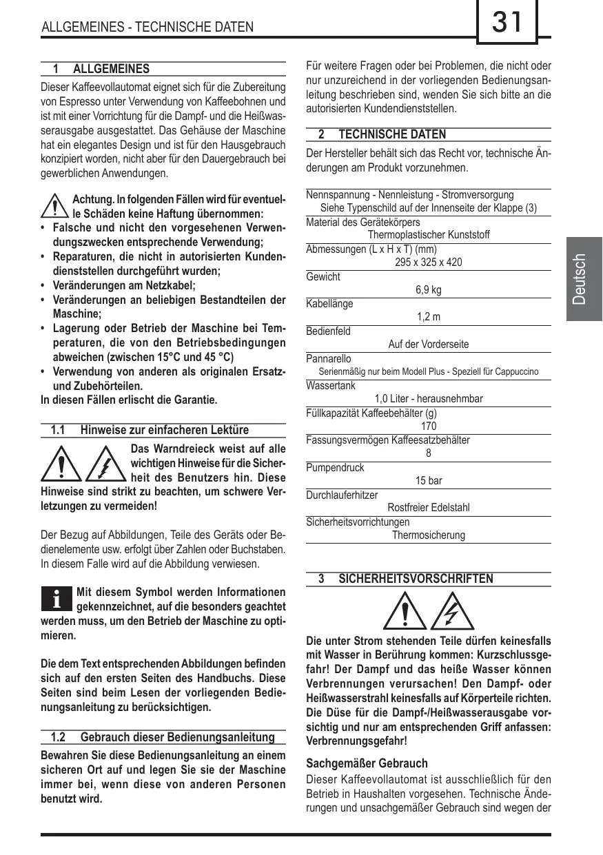 SICHERHEITSVORSCHRIFTEN Die unter Strom stehenden Teile dürfen keinesfalls mit Wasser in Berührung kommen: Kurzschlussgefahr! Der Dampf und das heiße Wasser können Verbrennungen verursachen! Den Dampf- oder Heißwasserstrahl keinesfalls auf Körperteile richten. Die Düse für die Dampf-/Heißwasserausgabe vorsichtig und nur am entsprechenden Griff anfassen: Verbrennungsgefahr! Sachgemäßer Gebrauch Dieser Kaffeevollautomat ist ausschließlich für den Betrieb in Haushalten vorgesehen. Technische Änderungen und unsachgemäßer Gebrauch sind wegen der Deutsch
