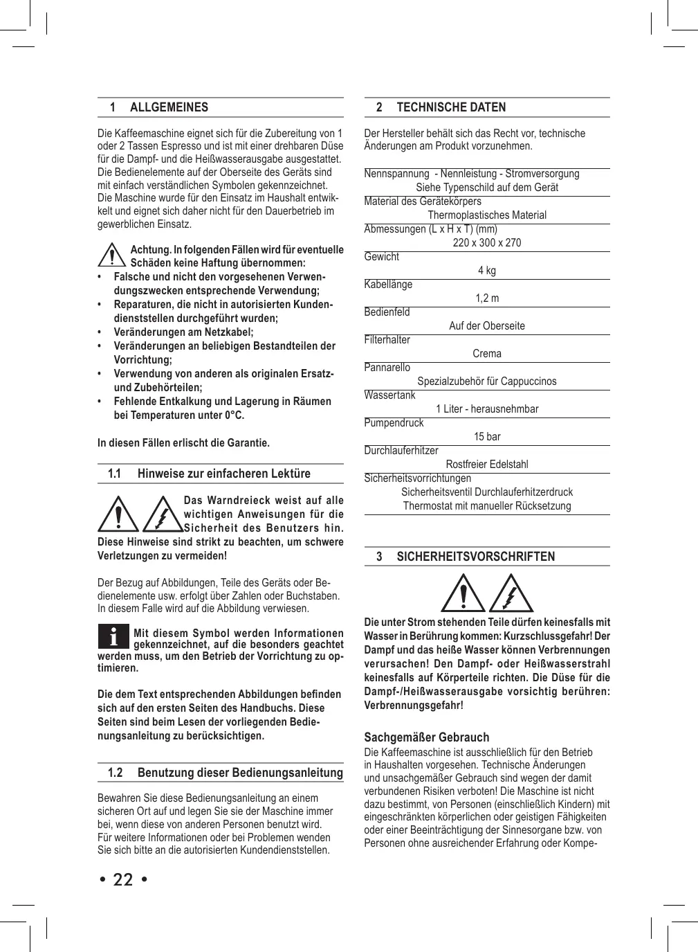 2 TECHNISCHE DATEN Die Kaffsemaschine eignet sich für die Zubereitung von 1 oder 2 Tassen Espresso und ist mit einer drehbaren Düse für die Dampf- und die HeiBwasserausgabe ausgestattet. Die Bedienelemente auf der Oberseite des Geräts sind mit einfach verständichen Symbolen gekennzeichnet. Die Maschine wurde für den Einsatz im Haushalt entwik- Kelt und eignet sich daher nicht für den Dauerbetrieb im gewerblichen Einsatz