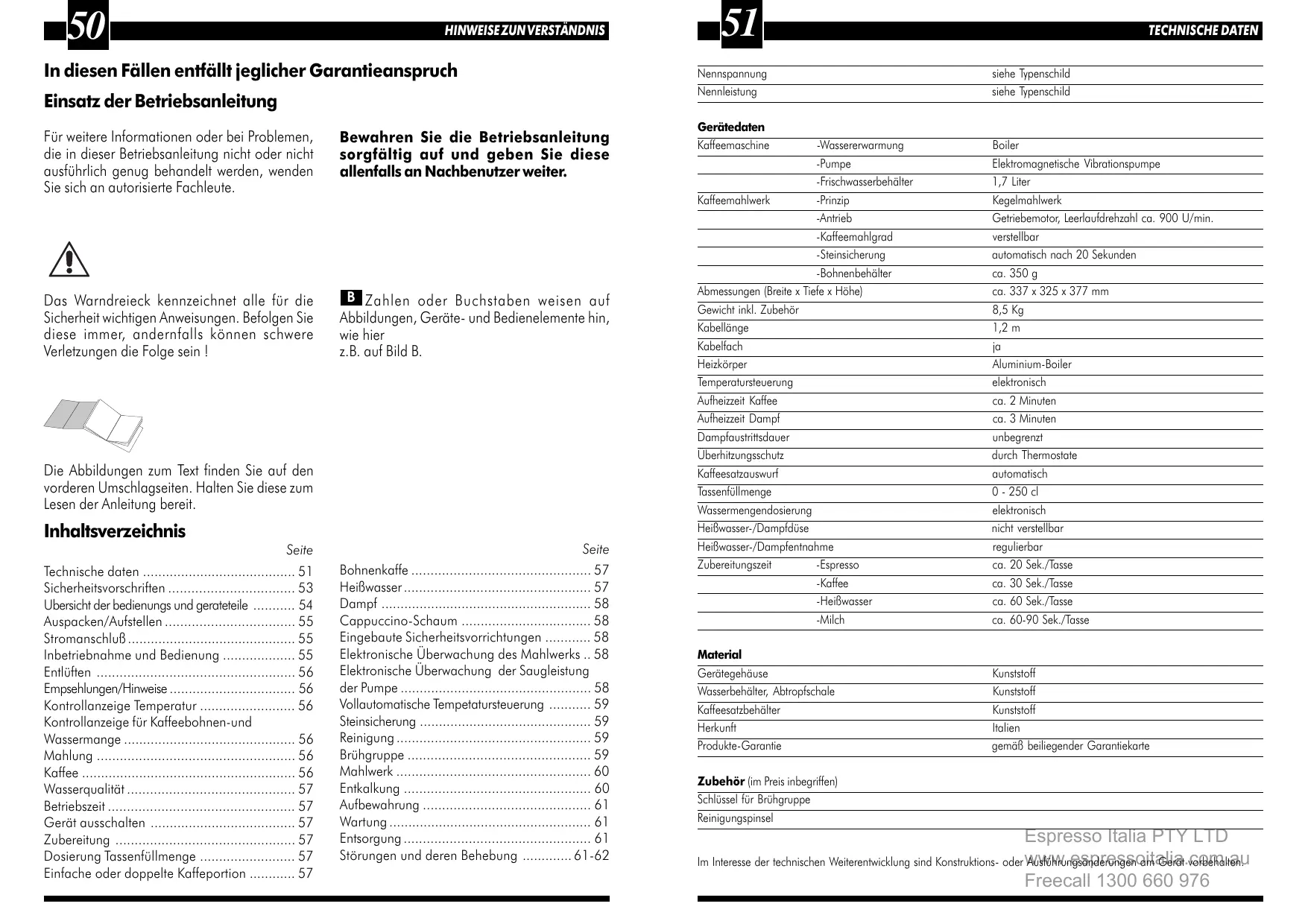 Espresso Italia PTY LTD Im Interesse der technischen Weiterentwicklung sind Konstruktions- oder www.espressoitalia.com.au Ausführungsänderungen am Gerät vorbehalten. Freecall 1300 660 976