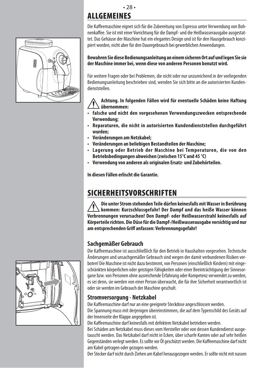 Achtung. In folgenden Fällen wird für eventuelle Schäden keine Haftung übernommen: falsche und nicht den vorgesehenen Verwendungszwecken entsprechende Verwendung; Reparaturen, die nicht in autorisierten Kundendienststellen durchgeführt wurden; Veränderungen am Netzkabel; Veränderungen an beliebigen Bestandteilen der Maschine; Lagerung oder Betrieb der Maschine bei Temperaturen, die von den Betriebsbedingungen abweichen (zwischen 15°C und 45 °C) Verwendung von anderen als originalen Ersatz- und Zubehörteilen.