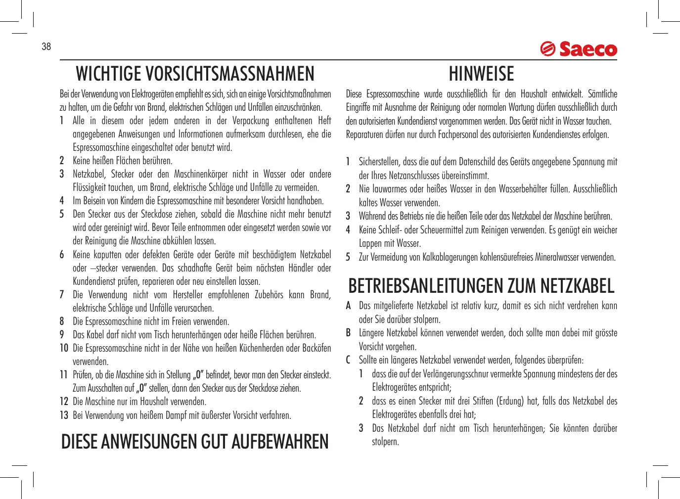 DIESE ANWEISUNGEN GUT AUFBEWAHREN HINWEISE Diese Espressomaschine wurde ausschlieBlich für den Haushalt entwickelt. Sämtliche Eingrifle mit Ausnahme der Reinigung oder normalen Wartung dürfen ausschlieBlich durch den autorisierten Kundendienst vorgenommen werden. Das Gerût nicht in Wasser tauchen. Reparaturen dürfen nur durch Fachpersonal des autorisierten Kundendienstes ertolgen.