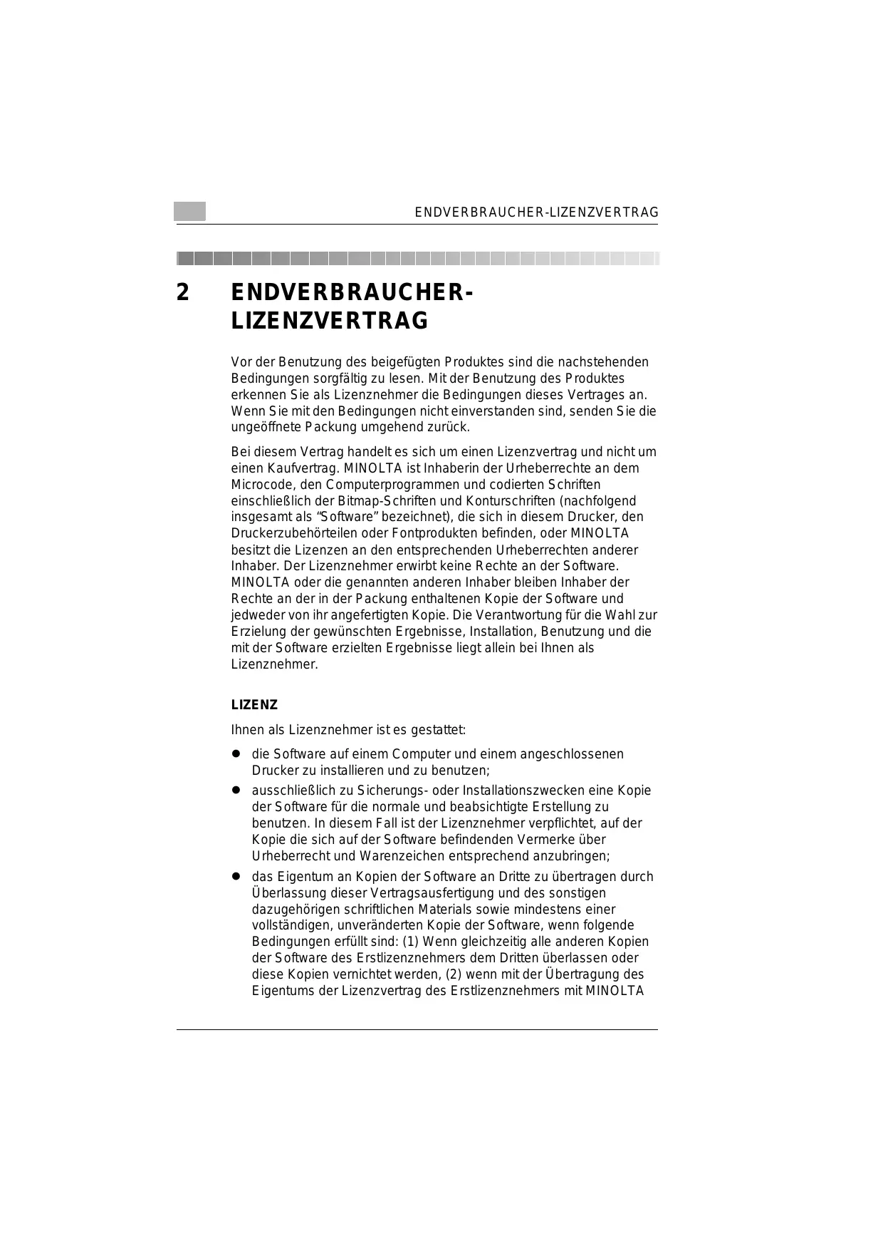 ENDVERBRAUCHER- LIZENZVERTRAG Vor der Benutzung des beigefügten Produktes sind die nachstehenden Bedingungen sorgfältig zu lesen. Mit der Benutzung des Produktes erkennen Sie als Lizenznehmer die Bedingungen dieses Vertrages an. Wenn Sie mit den Bedingungen nicht einverstanden sind, senden Sie die ungeüffnete P ackung umgehend zurück. Bei diesem Vertrag handeltes sich um einen Lizenzvertrag und nicht um einen Kaufvertrag. MINOLTA ist Inhaberin der Urheberrechte an dem Microcode, den Computerprogrammen und codierten S chriften einschlieRlich der Bitmap-S chriften und Konturschriften (nachfolgend insgesamt als “Software” bezeichnet), die sich in diesem Drucker, den Druckerzubehôrteilen oder Fontprodukten befinden, oder MINOLTA besitzt die Lizenzen an den entsprechenden Urheberrechten anderer Inhaber. Der Lizenznehmer erwirbt keine Rechte an der Software. MINOLTA oder die genannten anderen Inhaber bleiben Inhaber der Rechte an der in der Packung enthaltenen Kopie der Software und jedweder von ihr angefertigten Kopie. Die Verantwortung für die Wahlzur Erzielung der gewünschten Ergebnisse, Installation, Benutzung und die mit der Software erzielten Ergebnisse liegt allein bei Ihnen als Lizenznehmer. LIZENZ Ihnen als Lizenznehmer istes gestattet: e die Software auf einem Computer und einem angeschlossenen Drucker zu installieren und zu benutzen; e _ausschlieRlich zu Sicherungs- oder Installationszwecken eine Kopie der Software für die normale und beabsichtigte Erstellung zu benutzen. In diesem Fall ist der Lizenznehmer verpflichtet, auf der Kopie die sich auf der Software befindenden Vermerke über Urheberrecht und Warenzeichen entsprechend anzubringen; ©e das Eigentum an Kopien der Software an Dritte zu übertragen durch Überlassung dieser Vertragsausfertigung und des sonstigen dazugehôrigen schriftlichen Materials sowie mindestens einer vollständigen, unveränderten Kopie der Software, wenn folgende Bedingungen erfüllt sind: (1) Wenn gleichzeitig alle anderen Kopien der Software des Erstlizenznehmers dem Dritten überlassen oder diese Kopien vernichtet werden, (2) wenn mit der Übertragung des Eigentums der Lizenzvertrag des Erstlizenznehmers mit MINOLTA
