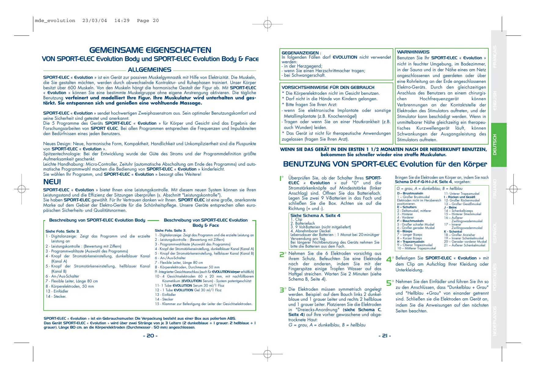 und "Hellblau +Grau" von einander getrennt sind. Schließen sie die Elektroden am Gerät an, indem Sie die Anweisungen auf den nächsten Seiten beachten. ITALIANO GEMEINSAME EIGENSCHAFTEN FRANÇAIS Page 20 ESPAÑOL ESPAGNOL 14:29 PORTUGUÊS 23/03/04 NEDERLANDS mde_evolution Mit dem Zubehör von SPORT-ELEC "Evolution" Body & Face (Gesichtselektroden, Serum und Gel) kann auch das Programm "Spannkraft für das Gesicht" benutzt werden. Dieses Training bewahrt die Festigkeit Ihres Gesichtsovals. Es schwächt Müdigkeitserscheinungen an Augenkontur und Stirn ab und strafft das Gesicht (Bekämpfung sogenannter "Hängebacken"). Das Gesichtsprogramm bietet Gesichtspflege komplett: Befeuchtung, Revitalisierung und Belebung. das Programm zuende ist, stellen Sie die 7° Sobald Stromstärkenknöpfe auf die Mindeststellung und den Schalter auf "0". Schalten Sie die Elektroden ab und lösen Sie sie vorsichtig von der Haut. Befeuchten Sie sie mit einigen Tropfen Wasser und legen Sie sie behutsam in ihren Schutz. Die Elektroden werden in der Originalverpackung an einem kühlen Ort (Gemüsefach im Kühlschrank) aufbewahrt. ZUM GEBRAUCH 8° RATSCHLAGE - Der Zyklus eines laufenden Programms kann auf einer anderen Empfehlungen : Das Gerät und die Elektroden können mit dem Haushaltsmüll entsorgt werden, da sie umweltfreundlich sind. Muskelgruppe fortgesetzt werden. Dabei ist zu beachten, dass ein und dieselbe Körperstelle nicht länger als 40 Minuten bearbeitet werden darf. Wenn Sie ein laufendes Programm unterbrechen möchten, brauchen Sie nur die beiden Knöpfe auf "0" zu stellen (Sie können das Gerät anschließend wieder neu starten). Wählen Sie dann ein neues Programm und starten Sie das Gerät wieder neu. - Wie man das Gerät optimal nutzt, entnehmen Sie bitte den Schemata in dieser Broschüre. - Das Gehäuse und die Kabel des SPORT-ELEC können mit einem in Desinfektionslösung (z.B. Mercryl) getauchten Wattebausch gereinigt werden (Lösung mit Wasser auf 1:10 verdünnt). - Benutzte Teile, z.B. die Elektroden, können vor und nach dem Gebrauch mit einem Desinfektionsmittel (z.B. Hexamidin) befeuchtet werden. - Nach dem Gebrauch müssen die Elektroden wieder in ihren Schutz gelegt und an einem kühlen Ort bei + 5-10°C aufbewahrt werden. - Bei längerer Nichtbenutzung des SPORT ELEC nehmen Sie bitte die Batterien aus dem Fach.Die Lebensdauer der 6 Elektroden reicht für ungefähr 40 Trainingszyklen. Neue Elektroden können Sie direkt bei unserem Firmensitz bestellen. Durch das patentgeschützte Elektrodensystem von SPORT-ELEC "Evolution" Body & Face verfügen Sie über eine sonst nirgends erhältliche Kombination von Elektro-Muskeltraining und Kosmetik.