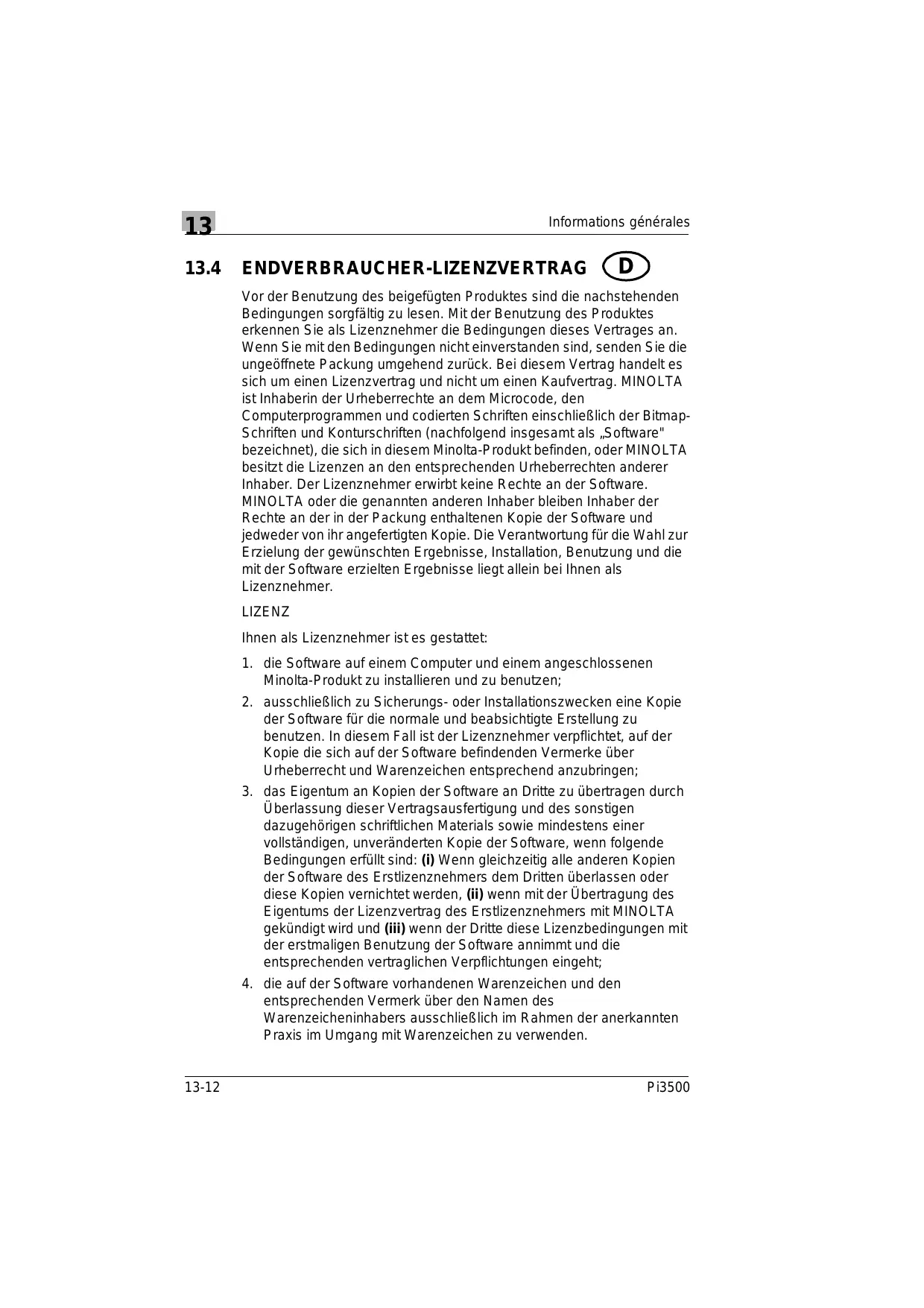 ANDERER FOLGESCHÄDEN, SELBST WENN MINOLTA ODER DIE AUTORISIERTEN HÄNDLER ÜBER MöGLICHE SCHÄDEN DIESER ART UNTERRICHTET WURDEN. MINOLTA HAFTET AUCH NICHT FÜR ANSPRÜCHE DES LIZENZNEHMERS AUFGRUND EINES ANSPRUCHS EINES DRITTEN. ALLGEMEINE BESTIMMUNGEN Der Lizenznehmer kann den Lizenzvertrag jederzeit beenden, indem er sämtliche Kopien der Software vernichtet oder entsprechend anderweitiger Bestimmungen dieses Vertrages handelt. MINOLTA kann den Lizenzvertrag mit dem Lizenznehmer beenden, wenn dieser diese Bedingungen nicht einhält. In diesem Fall erklärt sich der Lizenznehmer damit einverstanden, alle Kopien der Software zu vernichten. Jedweder Versuch, eine Kopie der Software zu anderen als den hier ausdrücklich genannten Zwecken zu vermieten, zu verleasen, zu übertragen oder eine Unterlizenz hiervon zu erteilen, ist nichtig. Der Lizenznehmer erkennt Pi3500 13-13 Informations générales
