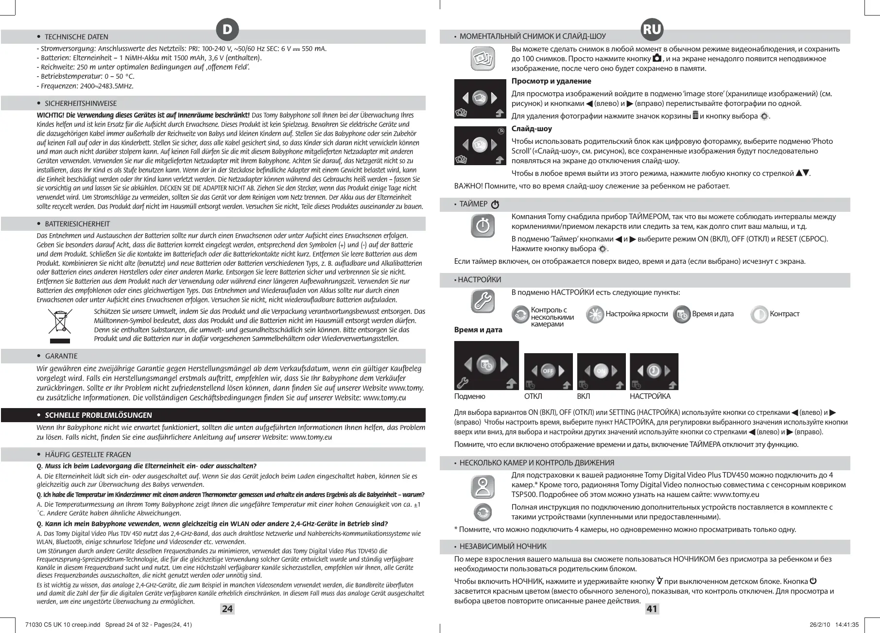 - ТЕХНИКА БЕЗОПАСНОСТИ ВАЖНО! Настоящая радионяня предназначена для использования только в помещении! Радионяня Tomy предназначена, чтобы помочь вам следить за ребенком и не заменяет собой присмотр взрослых. Это изделие не предназначено для игр. Всегда держите электрические компоненты и их кабели вне досягаемости маленьких детей. Ни при каких обстоятельствах не помещайте никакие части радионяни на в кроватку. Убедитесь, что все провода расположены безопасно, так что дети не смогут запутаться и нет опасности отключения. Ни при каких обстоятельствах не используйте блоки питания от радионяни с любым другим оборудованием. Не используйте с радионяней другие блоки питания, кроме блоков питания из комплекта поставки. Если надавить на подключенный блок питания, блок может быть поврежден или ребенок может получить телесные повреждения. Зарядные устройства при использовании могут нагреваться – обращайтесь с ними осторожно, дайте остыть. НЕ НАКРЫВАТЬ. Отключите зарядное устройство, если не собираетесь пользоваться изделием несколько дней. Во избежание поражения электрическим током отключайте изделие от блока питания перед уборкой. Аккумуляторы родительского блока подлежат переработке. Не выбрасывайте их с обычным мусором. Не пытайтесь демонтировать какие-либо части изделия. Sie können Fotos löschen, indem Sie das Papierkorbsymbol Помогите охране окружающей среды, ответственно подходя к утилизации изделия и упаковки. Символ передвижного мусорного контейнера показывает, что изделие и батареи нельзя выбрасывать вместе с домашним мусором, так как они содержат вещества, которые могут нанести вред окружающей среде и здоровью. Пожалуйста, воспользуйтесь специальными пунктами приема или переработки для утилизации изделия или батарей. drücken. Wenn Sie Ihre Elterneinheit als digitalen Bilderrahmen verwenden wollen, wählen Sie das abgebildete Untermenü ‚Bildauswahl’ und jedes gespeicherte Bild wird wiederholt nacheinander angezeigt, bis der Modus ausgeschaltet wird. Um diesen Modus zu beenden, drücken Sie eine der Pfeiltasten WICHTIG! Bitte beachten Sie, dass während dem Betrachten der gespeicherten Bilder keine Überwachung stattfindet.