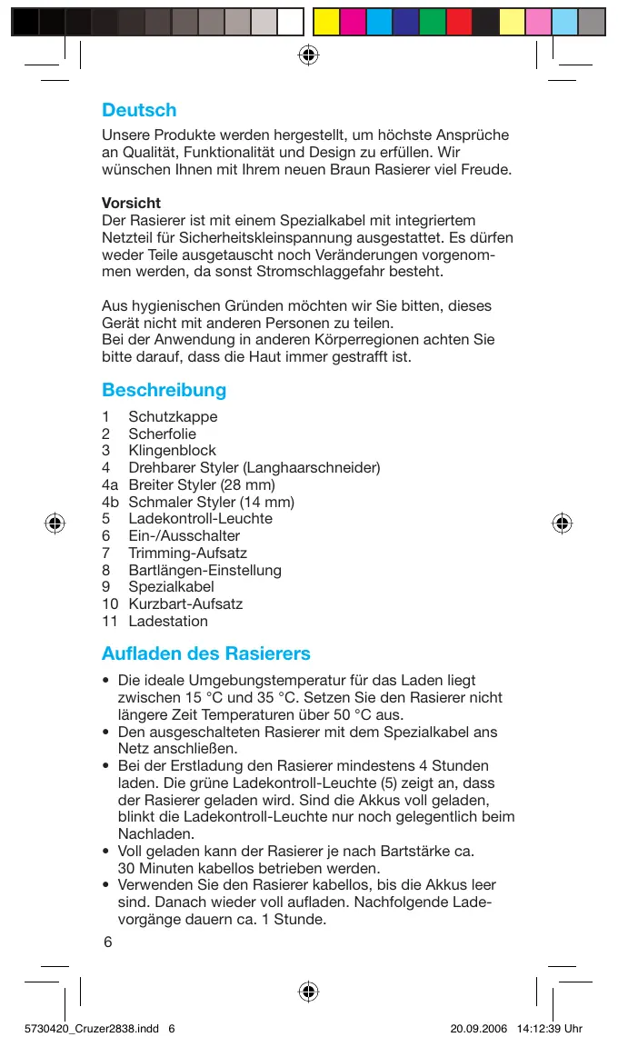 Deutsch Unsere Produkte werden hergestellt, um höchste Ansprüche an Qualität, Funktionalität und Design zu erfüllen. Wir wünschen Ihnen mit Ihrem neuen Braun Rasierer viel Freude. Vorsicht Der Rasierer ist mit einem Spezialkabel mit integriertem Netzteil für Sicherheitskleinspannung ausgestattet. Es dürfen weder Teile ausgetauscht noch Veränderungen vorgenommen werden, da sonst Stromschlaggefahr besteht. Aus hygienischen Gründen möchten wir Sie bitten, dieses Gerät nicht mit anderen Personen zu teilen. Bei der Anwendung in anderen Körperregionen achten Sie bitte darauf, dass die Haut immer gestrafft ist. Beschreibung