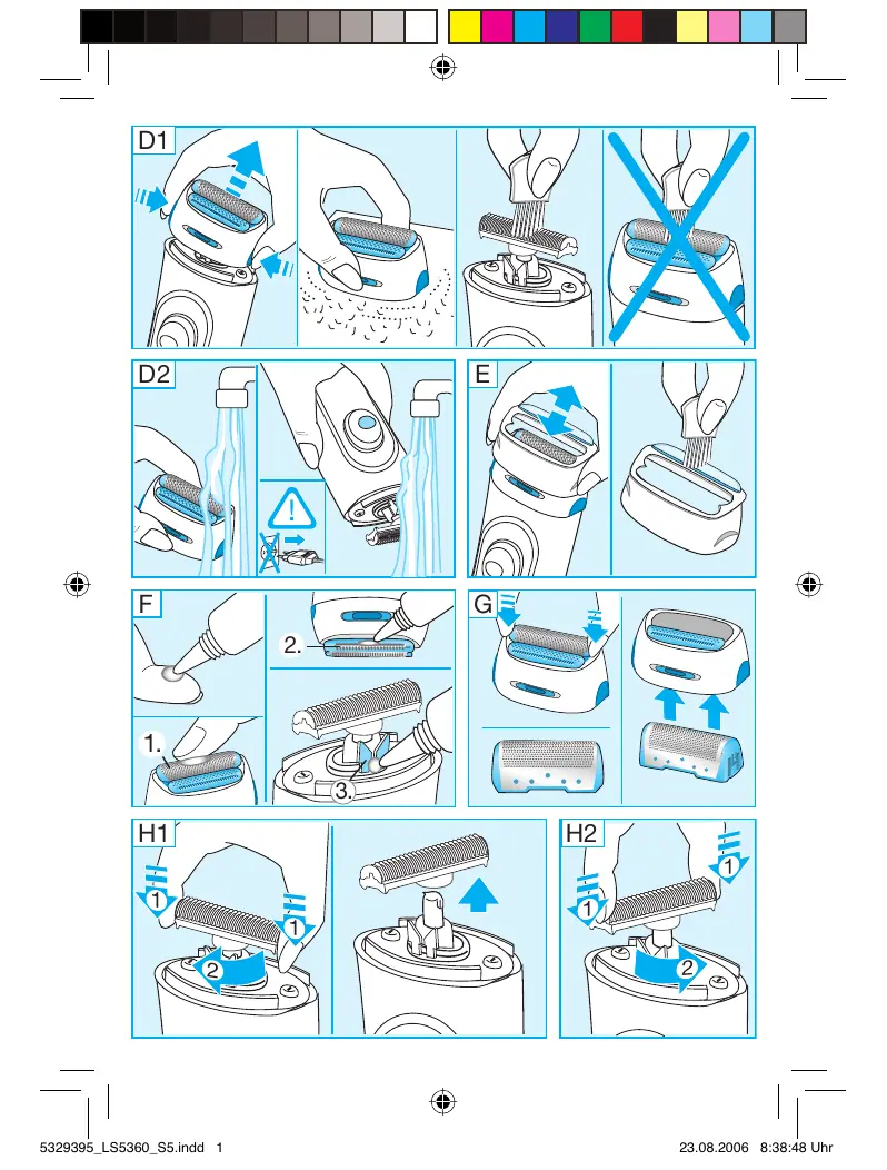 - Scherkopf und Klingenblock separat trocknen lassen. Reinigen des Skin Smoothing Aufsatzes Skin Smoothing Aufsatz abnehmen (E) und den Smoothing Pad (5a) gründlich ausbürsten. Sie können ihn auch gelegentlich mit Seifenwasser reinigen. Lassen Sie ihn vor der Wiederverwendung gründlich trocknen. Ein Ersatz-Pad (5b) wird mitgeliefert. Scherfolie: Entriegelungstasten drücken und den Scherkopf (2) abnehmen. Zum Lösen der Scherfolie drücken Sie den Kunststoffrahmen nach unten (G). Die neue Scherfolie wird von innen in den Scherkopf eingesetzt. Klingenblock: Um den Klingenblock abzunehmen, drücken und drehen Sie ihn um 90° (H1). Beim Aufsetzen des neuen Klingenblocks wieder drücken und um 90° drehen (H2).