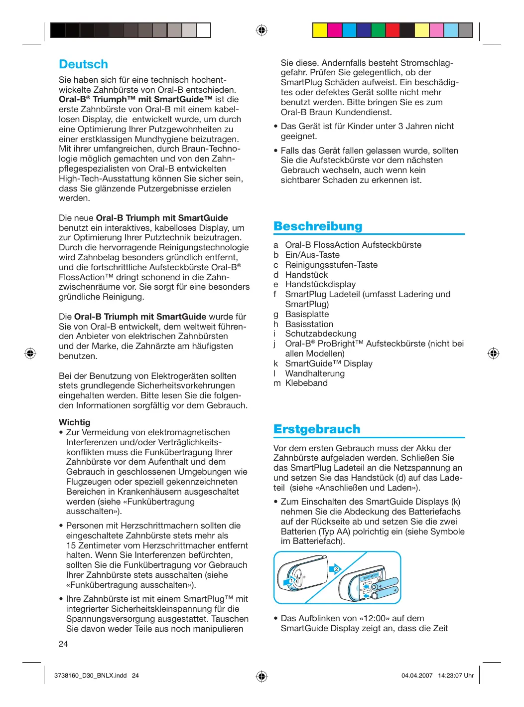 Deutsch Sie haben sich für eine technisch hochent- wickelte Zahnbürste von Oral-B entschieden. Oral-B° Triumph'" mit SmartGuide"" ist die erste Zahnbürste von Oral-B mit einem kabel- losen Display, die entwickelt wurde, um durch eine Optimierung Ihrer Putzgewohnheïten zu einer erstklassigen Mundhygiene beizutragen. Mit ihrer umfangreichen, durch Braun-Techno- logie môglich gemachten und von den Zahn- pflegespezialisten von Oral-B entwickelten High-Tech-Ausstattung kônnen Sie sicher sein, dass Sie glänzende Putzergebnisse erzielen werden. Die neue Oral-B Triumph mit SmartGuide benutzt ein interaktives, kabelloses Display, um zur Optimierung Ihrer Putztechnik beizutragen. Durch die hervorragende Reinigungstechnologie wird Zahnbelag besonders gründlich entfernt, und die fortschrittliche Aufsteckbürste Oral-B° FlossAction'" dringt schonend in die Zahn- zwischenräume vor. Sie sorgt für eine besonders gründliche Reinigung. Die Oral-B Triumph mit SmartGuide wurde für Sie von Oral-B entwickelt, dem weltweit führen- den Anbieter von elektrischen Zahnbürsten und der Marke, die Zahnärzte am häufigsten benutzen.