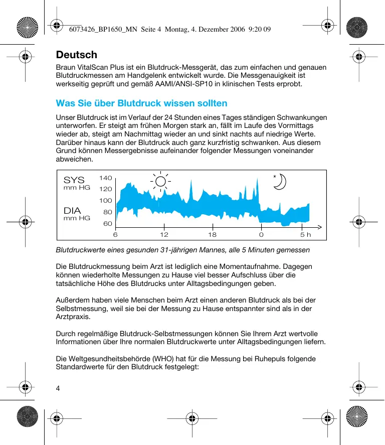 6073426_BP1650_MN Seite 4 Montag, 4. Dezember 2006 9:20 09 Deutsch Braun VitalScan Plus ist ein Blutdruck-Messgerät, das zum einfachen und genauen Blutdruckmessen am Handgelenk entwickelt wurde. Die Messgenauigkeit ist werkseitig geprüft und gemäß AAMI/ANSI-SP10 in klinischen Tests erprobt. Was Sie über Blutdruck wissen sollten Unser Blutdruck ist im Verlauf der 24 Stunden eines Tages ständigen Schwankungen unterworfen. Er steigt am frühen Morgen stark an, fällt im Laufe des Vormittags wieder ab, steigt am Nachmittag wieder an und sinkt nachts auf niedrige Werte. Darüber hinaus kann der Blutdruck auch ganz kurzfristig schwanken. Aus diesem Grund können Messergebnisse aufeinander folgender Messungen voneinander abweichen. SYS