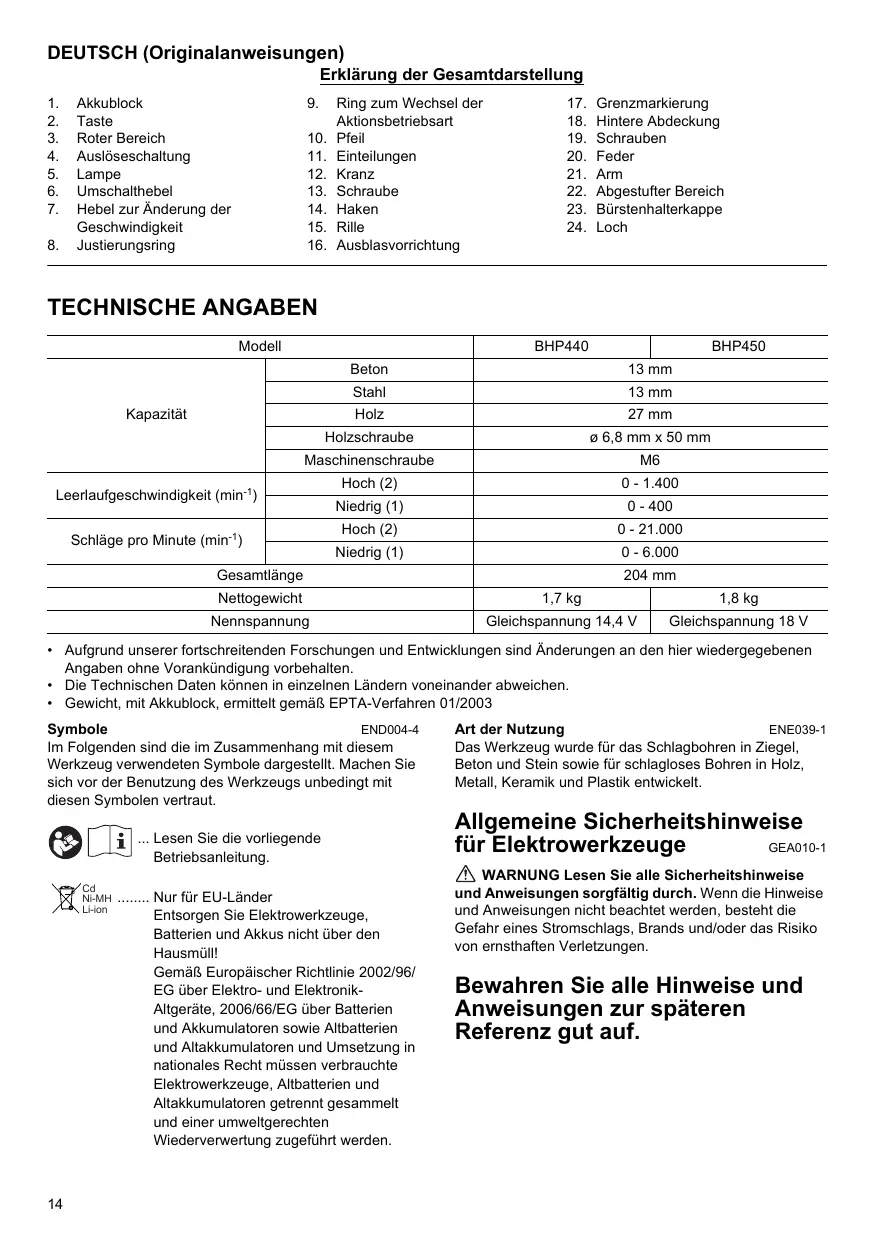 TECHNISCHE ANGABEN Modell BHP440 BHP450 Beton 13 mm Stahl 13 mm Kapazität Hoz 27 mm Holzschraube 9 6,8 mm x 50 mm Maschinenschraube M6 Hoch (2) 0-1.400 Leerlaufgeschwindigkeit (min) Niedrig (1) 0-400 Hoch (2) 0-21.000 Schläge pro Minute (min) Niedrig (1) 0-6.000 Gesamtlänge 204 mm Nettogewicht T7kg 18kg Nennspannung Gleichspannung 14,4 V | Gleichspannung 18 V + Aufgrund unserer fortschreitenden Forschungen und Entwicklungen sind Ânderungen an den hier wiedergegebenen Angaben ohne Vorankündigung vorbehalten. +_Die Technischen Daten kônnen in einzelnen Ländern voneinander abweïchen. + Gewicht, mit Akkublock, ermittelt gemäf EPTA-Verfahren 01/2003 Symbole ENDO04-4 Im Folgenden sind die im Zusammenhang mit diesem Werkzeug venwendeten Symbole dargestellt. Machen Sie Sich vor der Benutzung des Werkzeugs unbedingt mit diesen Symbolen vertraut. @[E KE - Lesen Sie die vorliegende Betriebsanleitung. Nur für EU-Länder Entsorgen Sie Elektrowerkzeuge, Batterien und Akkus nicht über den Hausmüll! Gemä8 Europäischer Richtlinie 2002/96/ EG über Elektro- und Elektronik- Altgeräte, 2006/66/EG über Batterien und Akkumulatoren sowie Altbatterien und Altakkumulatoren und Umsetzung in nationales Recht müssen verbrauchte Elektrowerkzeuge, Altbatterien und Altakkumulatoren getrennt gesammelt und einer umweltgerechten Wiederverwertung zugeführt werden Art der Nutzung ENE039-1 Das Werkzeug wurde für das Schlagbohren in Ziegel, Beton und Stein sowie für schlagloses Bohren in Holz, Metall, Keramik und Plastik entwickelt. Allgemeine Sicherheitshinweise für Elektrowerkzeuge À\ WARNUNG Lesen Sie alle Sicherheitshinweise und Anweisungen sorgfältig durch. Wenn die Hinweise und Anweisungen nicht beachtet werden, besteht die Gefahr eines Stromschlags, Brands und/oder das Risiko von emsthaften Verletzungen. GEA010-1 Bewahren Sie alle Hinweise und Anweisungen zur späteren Referenz gut auf.