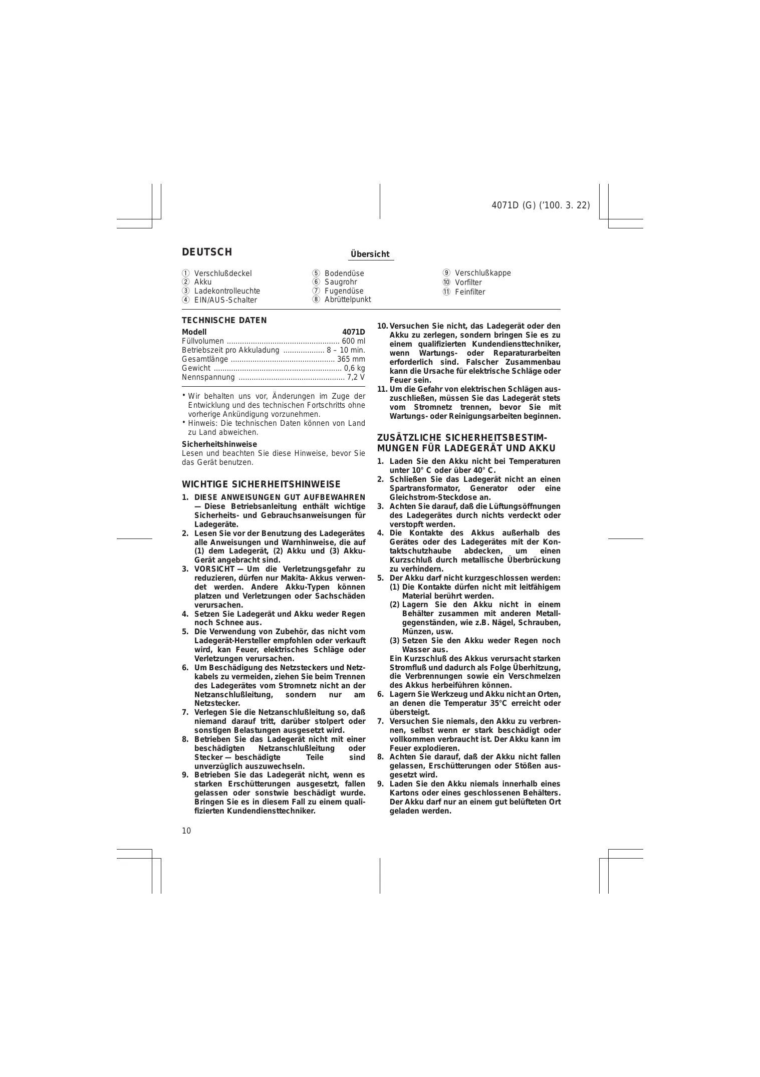 ZUSÄTZLICHE SICHERHEITSBESTIMMUNGEN FÜR LADEGERÄT UND AKKU 1. Laden Sie den Akku nicht bei Temperaturen unter 10° C oder über 40° C. 2. Schließen Sie das Ladegerät nicht an einen Spartransformator, Generator oder eine Gleichstrom-Steckdose an. 3. Achten Sie darauf, daß die Lüftungsöffnungen des Ladegerätes durch nichts verdeckt oder verstopft werden. 4. Die Kontakte des Akkus außerhalb des Gerätes oder des Ladegerätes mit der Kontaktschutzhaube abdecken, um einen Kurzschluß durch metallische Überbrückung zu verhindern. 5. Der Akku darf nicht kurzgeschlossen werden: (1) Die Kontakte dürfen nicht mit leitfähigem Material berührt werden. (2) Lagern Sie den Akku nicht in einem Behälter zusammen mit anderen Metallgegenständen, wie z.B. Nägel, Schrauben, Münzen, usw. (3) Setzen Sie den Akku weder Regen noch Wasser aus. Ein Kurzschluß des Akkus verursacht starken Stromfluß und dadurch als Folge Überhitzung, die Verbrennungen sowie ein Verschmelzen des Akkus herbeiführen können. 6. Lagern Sie Werkzeug und Akku nicht an Orten, an denen die Temperatur 35°C erreicht oder übersteigt. 7. Versuchen Sie niemals, den Akku zu verbrennen, selbst wenn er stark beschädigt oder vollkommen verbraucht ist. Der Akku kann im Feuer explodieren. 8. Achten Sie darauf, daß der Akku nicht fallen gelassen, Erschütterungen oder Stößen ausgesetzt wird. 9. Laden Sie den Akku niemals innerhalb eines Kartons oder eines geschlossenen Behälters. Der Akku darf nur an einem gut belüfteten Ort geladen werden.
