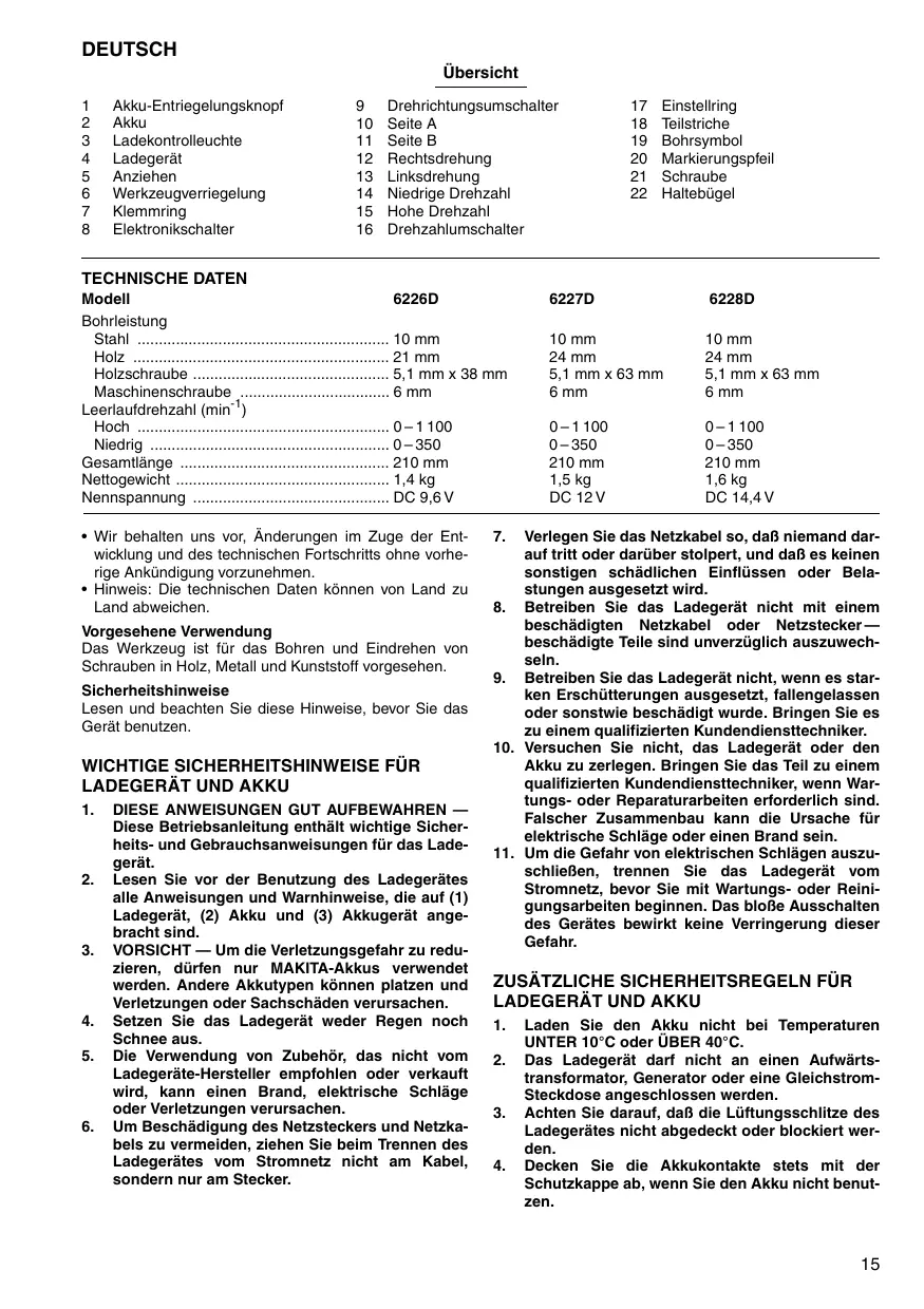 Übersicht 1 Akku-Entriegelungsknopf 9 Drehrichtungsumschalter 17. Einstellring 2 Akku 10 Seite À 18 Teilstriche 3 Ladekontrolleuchte 11 Seite B 19 Bohrsymbol 4 Ladegerät 12 Rechtsdrehung 20. Markierungspfeil 5 Anziehen 13 Linksdrehung 21 Schraube 6 Werkzeugverriegelung 14 Niedrige Drehzahl 22 Haltebügel 7 Klemmring 15 Hohe Drehzahl 8 Elektronikschalter 16 Drehzahlumschalter TECHNISCHE DATEN Modell 6226D 6227D 6228D Bohrleistung