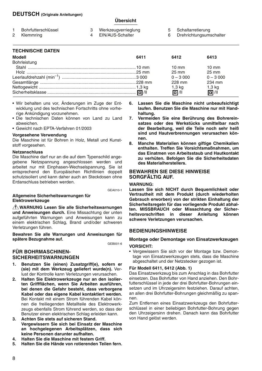 DEUTSCH (originale Anleitungen) Übersicht 1 Bohrutterschlüssel 3 Werkzeugverrieglung 5 Schaltarretierung 2 Klemmring 4 EIN/AUS-Schalter 6 Drehrichtungsumschalter TECHNISCHE DATEN Modell 6411 6412 6413 Bohrleistung Stahl 10 mm 10 mm 10 mm Holz . .. : 25 mm 25 mm 25 mm Leerlaufdrehzahl {min”1) 3 000 0-3 000 0-3 000 Gesamtlänge . 228 mm 228 mm 234 mm Nettogewicht 1,3kg 1,3kg 1,3kg Sicherheitsklasse [CU [QUI [QU + Wir behalten uns vor, Anderungen im Zuge der Ent- wicklung und des technischen Fortschritts ohne vorhe- rige Ankündigung vorzunehmen. + Die technischen Daten kônnen von Land zu Land abweichen. + Gewicht nach EPTA-Verfahren 01/2003 Vorgesehene Verwendung Die Maschine ist für Bohren in Holz, Metal und Kunst- Stoff vorgesehen. Netzanschluss Die Maschine darf nur an die auf dem Typenschild ange- gebene Netzspannung angeschlossen werden und arbeitet nur mit Einphasen-Wechselspannung. Sie ist entsprechend den Europäischen Richilinien_ doppelt schutzisoliert und kann daher auch an Steckdosen ohne Erdanschluss betrieben werden. GEaot04 Allgemeine Sicherheitswarnungen für Elektrowerkzeuge Â\ WARNUNG Lesen Sie alle Sicherheitswarnungen und Anweisungen durch. Eine Missachtung der unten aufgeführten Wamungen und Anweisungen kann zu einem elektischen Schlag, Brand und/oder schweren Verletzungen führen. Bewahren Sie alle Warnungen und Anweisungen für spätere Bezugnahme auf. Gesoots