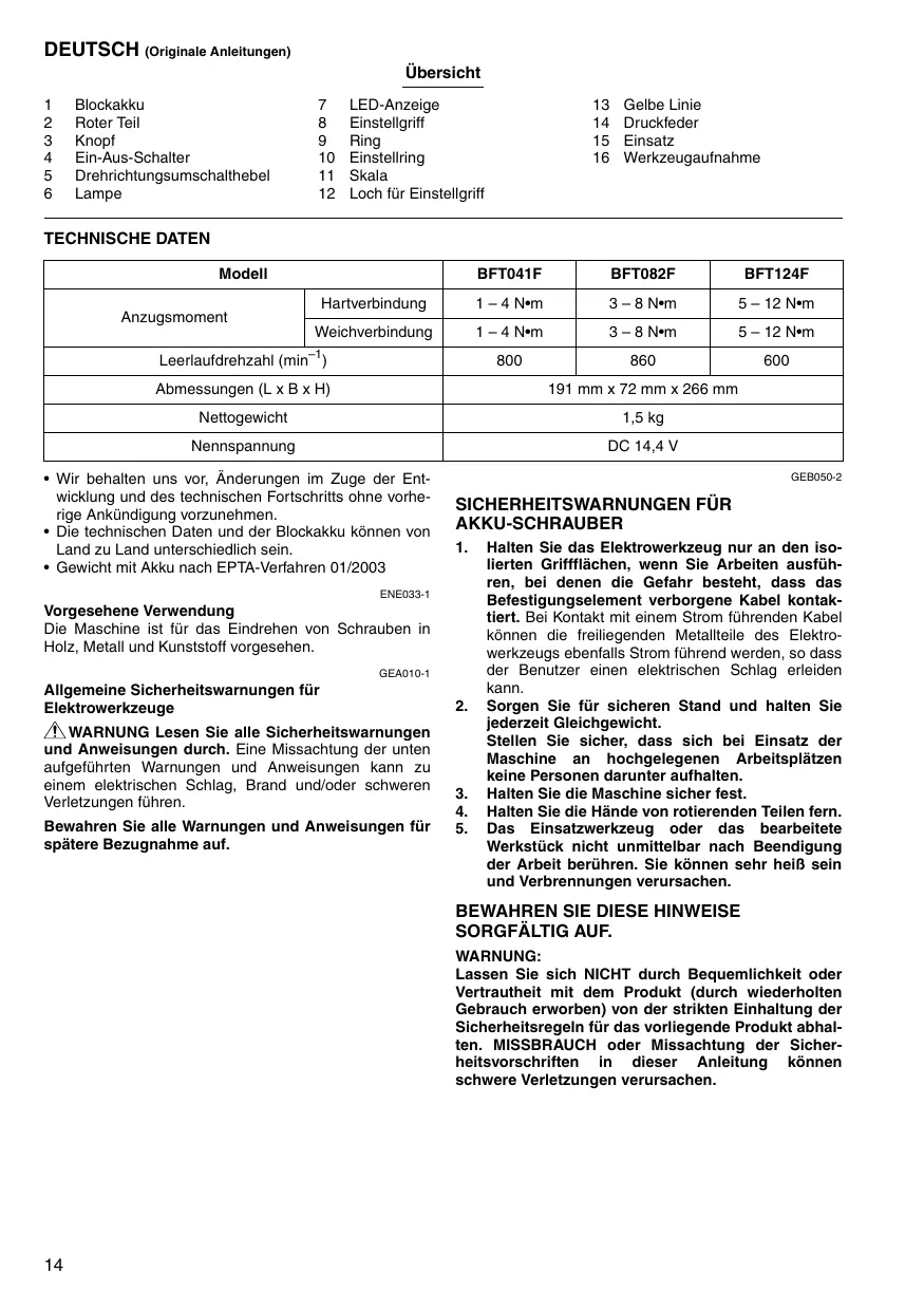 ENE033-1 Vorgesehene Verwendung Die Maschine ist für das Eindrehen von Schrauben in Holz, Metall und Kunststoff vorgesehen. GEA010-1 Allgemeine Sicherheitswarnungen für Elektrowerkzeuge WARNUNG Lesen Sie alle Sicherheitswarnungen und Anweisungen durch. Eine Missachtung der unten aufgeführten Warnungen und Anweisungen kann zu einem elektrischen Schlag, Brand und/oder schweren Verletzungen führen. Bewahren Sie alle Warnungen und Anweisungen für spätere Bezugnahme auf.