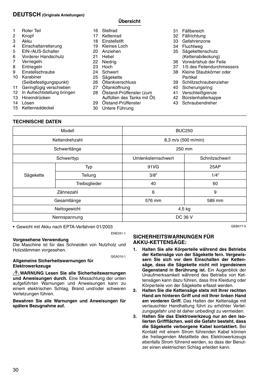 - Gewicht mit Akku nach EPTA-Verfahren 01/2003 ENE031-1 Vorgesehene Verwendung Die Maschine ist für das Schneiden von Nutzholz und Holzstämmen vorgesehen. GEB071-5