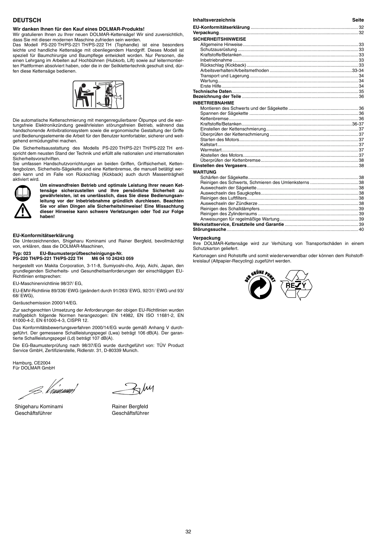 EU-Konformitätserklärung Die Unterzeichnenden, Shigeharu Kominami und Rainer Bergfeld, bevolmächtigt von, erklären, dass die DOLMAR-Maschinen,