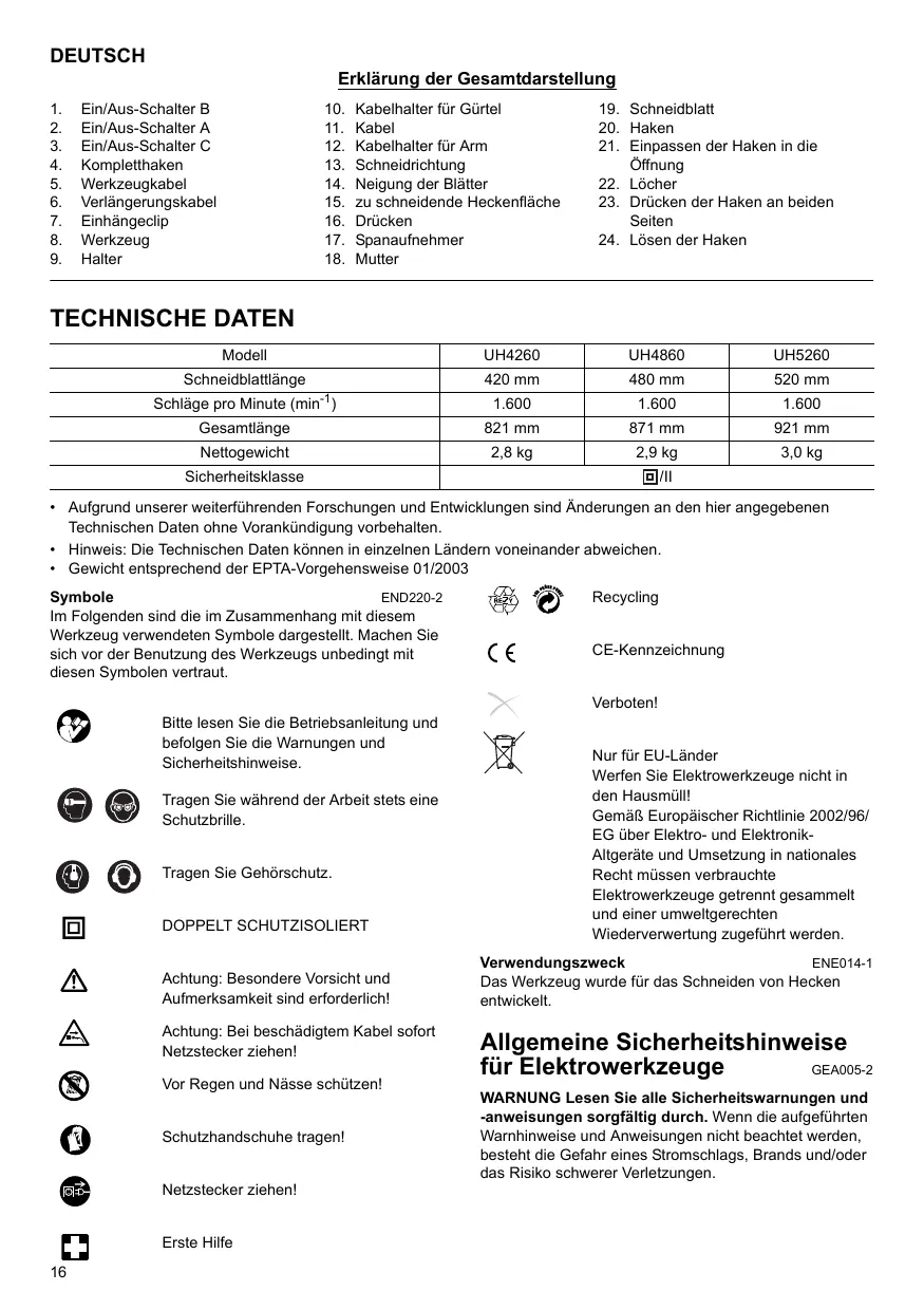 TECHNISCHE DATEN Modell UH4260 UH4860 UH5260 Schneidblattlänge 420 mm 480 mm 520 mm Schläge pro Minute (min-1)