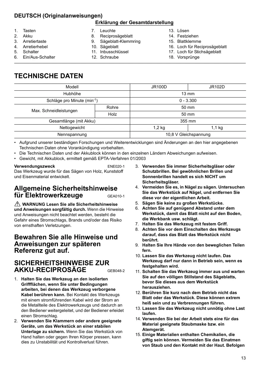 BEDIENUNGSANLEITUNG JR102D MAKITA