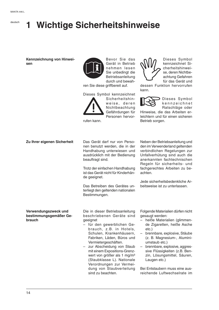MAKITA 446 L Raum vorhanden sein, wenn die Abluft des Gerätes in den Raum zurückgeht (beachten Sie hierzu die für Sie gültigen nationalen Bestimmungen). Das Bedienungspersonal des Gerätes ist vor der Arbeit zu