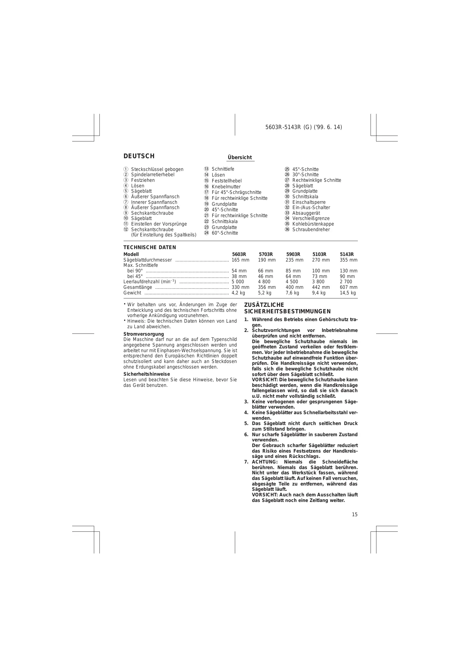 5603R-5143R (G) (’99. 6. 14) BEDIENUNGSHINWEISE Demontage bzw. Montage des Sägeblatts Folgende Sägeblätter sind für die Säge geeignet Modell max. Durchmesser min. Durchmesser Sägeblattstärke Schnittbrette 5603R 165 mm 150 mm 1,6 mm oder weniger 1,9 mm oder mehr 5703R 190 mm 170 mm 1,6 mm oder weniger 1,9 mm oder mehr 5903R 235 mm 210 mm 1,7 mm oder weniger 2,1 mm oder mehr 5103R 270 mm 260 mm 1,8 mm oder weniger 2,2 mm oder mehr 5143R 355 mm 350 mm 2,3 mm oder weniger 2,7 mm oder mehr Die Stärke des Spaltkeils beträgt 1,8 mm für Modell 5603R und 5703R oder 2,0 mm für Modell 5903R und 5103R oder 2,5 mm für Modell 5143R. VORSICHT: