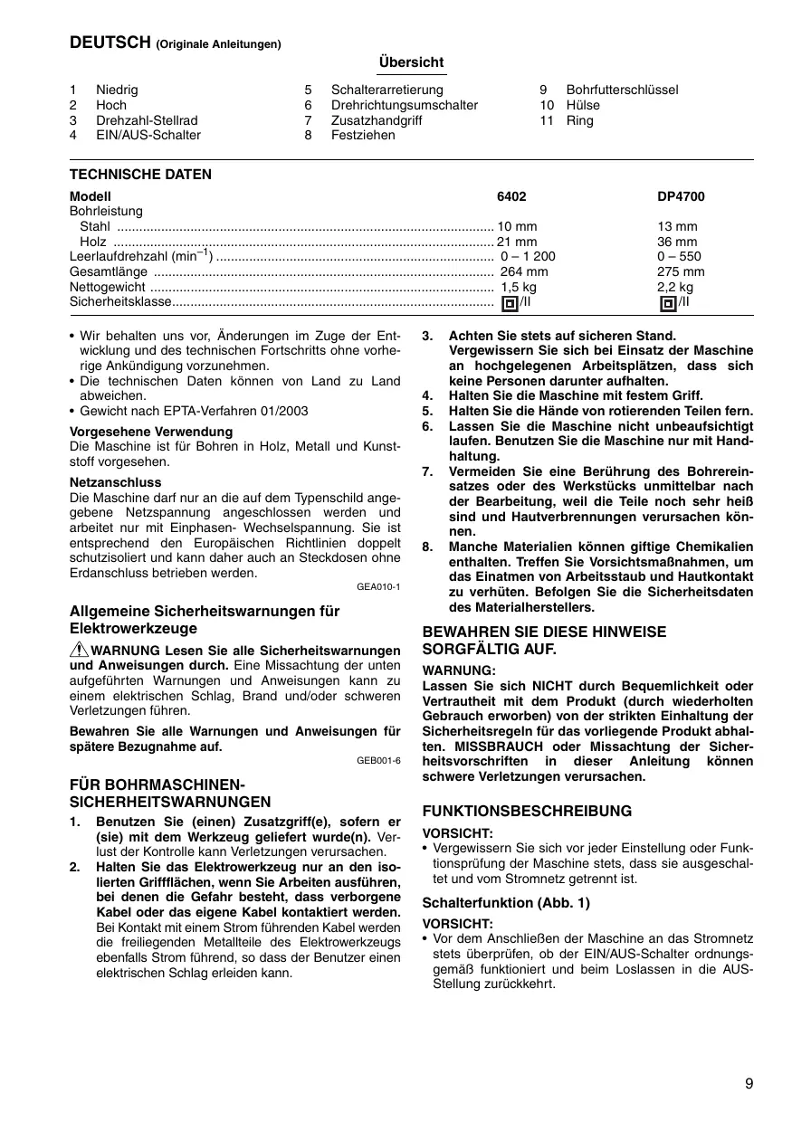 DEUTSCH (originale Anleitungen) Übersicht 1 Niedrig 5 Schalterarretierung 9 Bohrutterschlüssel 2 Hoch 6 Drehrichtungsumschalter 10 Hülse 3 Drehzahi-Stellrad 7 Zusatzhandgriff 11 Ring 4 EIN/AUS-Schalter 8 Festziehen TECHNISCHE DATEN Modell 6402 DP4700 Bohrleistung Stahl 13mm Holz …. 36 mm Leerlaufdrehzahl (min! 0-1 200 0-550 Gesamtlänge 264 mm 275 mm Nettogewicht . 2,2kg Sicherheitsklasse . oi + Wir behalten uns vor, Anderungen im Zuge der Ent- wicklung und des technischen Fortschritts ohne vorhe- rige Ankündigung vorzunehmen. + Die technischen Daten kônnen von Land zu Land abweichen. + Gewicht nach EPTA-Verfahren 01/2003 Vorgesehene Verwendung Die Maschine ist für Bohren in Holz, Metall und Kunst- stoff vorgesehen. Netzanschluss Die Maschine darf nur an die auf dem Typenschild ange- gebene Netzspannung angeschlossen werden und arbeitet nur mit Einphasen- Wechselspannung. Sie ist entsprechend den Europäischen Richllinien doppelt schutzisoliert und kann daher auch an Steckdosen ohne Erdanschluss betrieben werden. GEADIO4 Allgemeine Sicherheitswarnungen für Elektrowerkzeuge A\ WARNUNG Lesen Sie alle Sicherheitswarnungen und Anweisungen durch. Eine Missachtung der unten aufgeführten Warnungen und Anweisungen kann zu einem elektrischen Schlag, Brand und/oder schweren Verletzungen führen. Bewahren Sie alle Warnungen und Anweisungen für spätere Bezugnahme auf. GeBoots