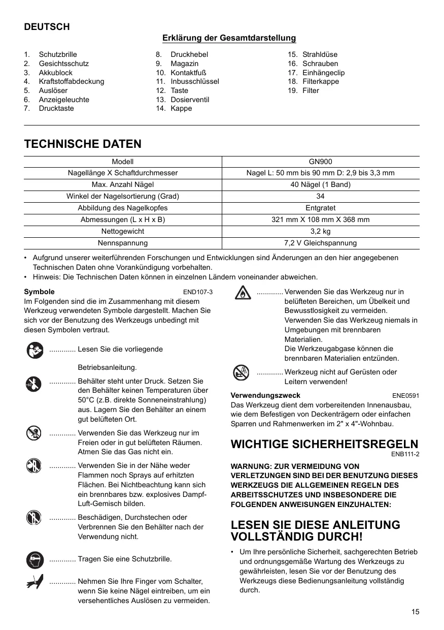 TECHNISCHE DATEN Modell GN900 Nagellänge X Schaftdurchmesser Nagel L: 50 mm bis 90 mm ,9 bis 3,3 mm Max. Anzahl Nägel 40 Nägel (1 Band) Winkel der Nagelsortierung (Grad) 34 Abbildung des Nagelkoptes Entgratet Abmessungen (Lx H x B) 321 mm X 108 mm X 368 mm Nettogewicht 3,2kg Nennspannung 7.2 V Gleichspannung + Aufgrund unserer weiterführenden Forschungen und Entwicklungen sind Ânderungen an den hier angegebenen Technischen Daten ohne Vorankündigung vorbehalten. + Hinweis: Die Technischen Daten kônnen in einzelnen Ländem voneinander abweichen: Symbole END407-3 Im Folgenden sind die im Zusammenhang mit diesem Werkzeug venwendeten Symbole dargestellt. Machen Sie Sich vor der Benutzung des Werkzeugs unbedingt mit diesen Symbolen vertraut. Lesen Sie die vorliegende Betriebsanleitung. Behälter steht unter Druck. Setzen Sie den Behälter keinen Temperaturen über 50°C (z.B. direkte Sonneneinstrahlung) aus. Lagem Sie den Behälter an einem gut belüfteten Ort. Venwenden Sie das Werkzeug nur im Freien oder in gt belüfteten Räumen Atmen Sie das Gas nicht ein. Verwenden Sie in der Nähe weder Flammen noch Sprays auf erhitzten Flächen. Bei Nichtbeachtung kann sich ein brennbares bzw. explosives Dampt- Luft-Gemisch bilden. Beschädigen, Durchstechen oder Verbrennen Sie den Behälter nach der Verwendung nicht. .. Tragen Sie eine Schutzbrille. _ Nehmen Sie Ihre Finger vom Schalter, wenn Sie keine Nägel eintreiben, um ein versehentliches Auslôsen zu vermeiden