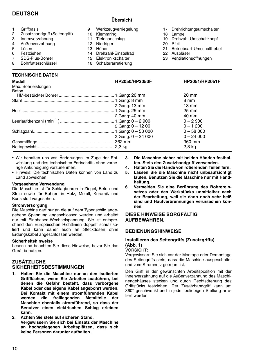 DEUTSCH Übersicht 1 Griffbasis 9 Werkzeugverriegelung 17. Drehrichtungsumschalter 2 Zusatzhandgriff (Seitengriff) 10 Klemmring 18 Lampe 3 Innenverzahnung 11 Tiefenanschlag 19 Drehzahl-Umschaltknopf 4 AuBenverzahnung 12 Niedriger 20 Pfeil 5 Lôsen 13 Hôher 21 Betriebsart-Umschalthebel 6 Festziehen 14 Drehzahl-Einstellrad 22 Ausbläser 7 SDS-Plus-Bohrer 15 Elektronikschalter 23 Ventilationsôffnungen 8 Bohriutterschlüssel 16 Schalterarretierung TECHNISCHE DATEN Modell HP2050/HP2050F HP2051/HP2051F Max. Bohrieistungen Beton HM-bestückter Bohrer . . 1.Gang: 20 mm 20 mm Stahl . 1.Gang: 8 mm 8mm 2.Gang: 13 mm 13 mm Hoiz .1.Gang: 25 mm 25 mm 2.Gang: 40 mm 40 mm Leerlaufdrehzahl (min! ) .1.Gang: 0 — 2 900 0-2 900 2.Gang: 0 — 12 00 0-1 200 Schlagzahl. .1.Gang: 0 — 58 000 0-58 000 2.Gang: 0 — 24 000 0-24 000 Gesamtiänge 362 mm 360 mm Nettogewichi. ,3 kg 2,3 kg + Wir behalten uns vor, Anderungen im Zuge der Ent- wicklung und des technischen Fortschritts ohne vorhe- rige Ankündigung vorzunehmen. + Hinweis: Die technischen Daten kônnen von Land zu Land abweichen. Vorgesehene Verwendung Die Maschine ist für Schlagbohren in Ziegel, Beton und Stein sowie für Bohren in Holz, Metall, Keramik und Künststoff vorgesehen. Stromversorgung Die Maschine darf nur an die auf dem Typenschild ange- gebene Spannung angeschlossen werden und arbeitet nur mit Einphasen-Wechselspannung. Sie ist entspre- chend den Europäischen Richlinien doppelt schutziso- liert und kann daher auch an Steckdosen ohne Erdungskabel angeschlossen werden. Sicherheitshinweise Lesen und beachten Sie diese Hinweise, bevor Sie das Gerät benutzen. ZUSÂTZLICHE SICHERHEITSBESTIMMUNGEN