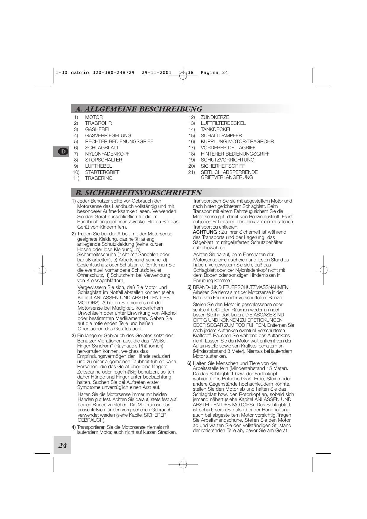 Arbeitsstelle fern (Mindestabstand 15 Meter). Da das Schlagblatt bzw. der Fadenkopf während des Betriebs Gras, Erde, Steine oder andere Gegenstände hochschleudern könnte, stellen Sie den Motor ab und halten Sie das Schlagblatt bzw. den Rotorkopf an, sobald sich jemand nähert (siehe Kapitel ANLASSEN UND ABSTELLEN DES MOTORS). Das Schlagblatt ist scharf; seien Sie also bei der Handhabung auch bei abgestelltem Motor vorsichtig.Tragen Sie Arbeitshandschuhe. Stellen Sie den Motor ab und warten Sie den vollständigen Stillstand der rotierenden Teile ab, bevor Sie am Gerät 1-30 cabrio 320-380-248729 29-11-2001 arbeiten oder das Schlagblatt bzw. den Fadenkopf berühren. Dies gilt besonders für das Entfernen von festgesetztem Material.
