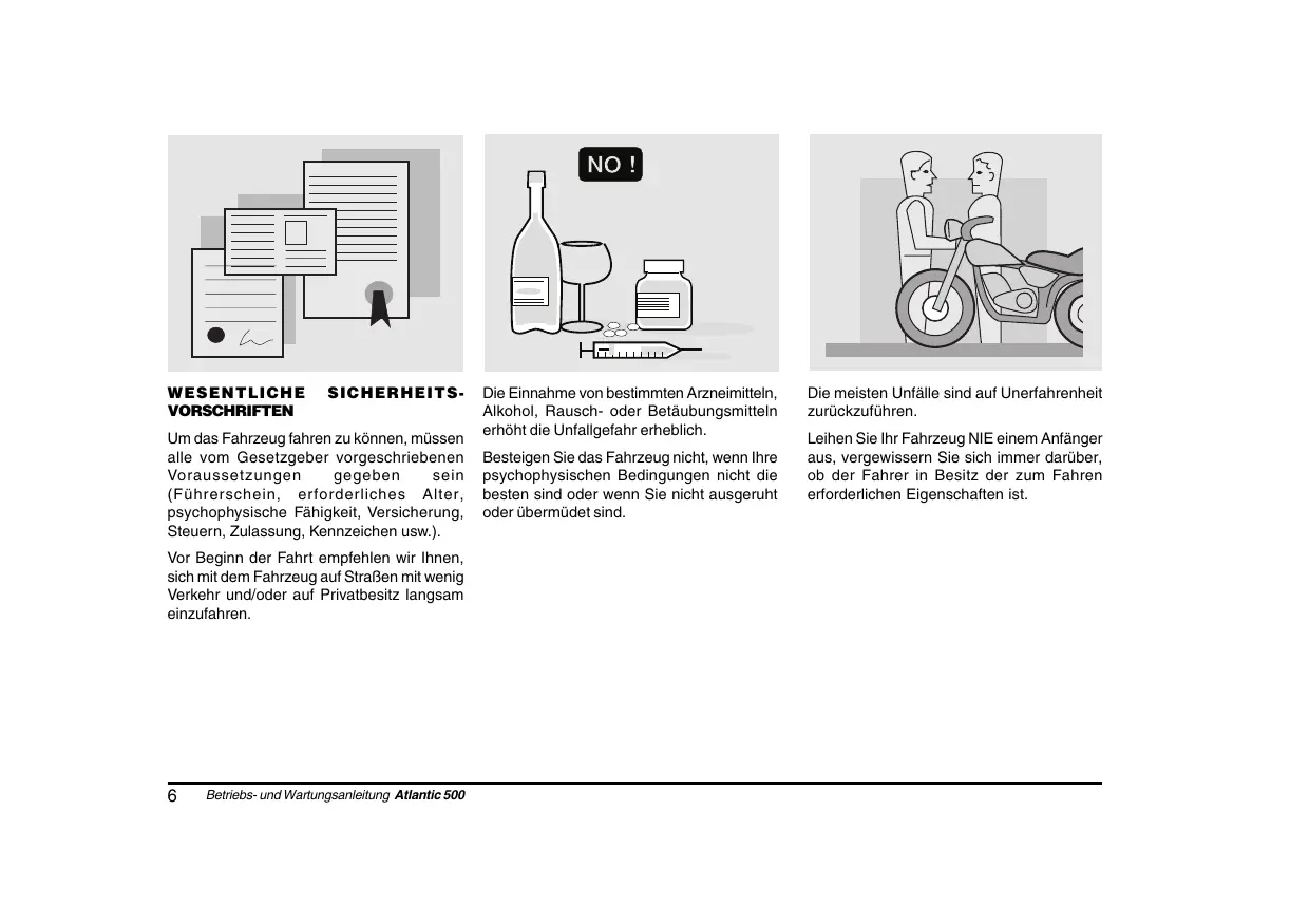 BEKLEIDUNG Vor dem Losfahren nicht vergessen, den Schutzhelm aufzusetzen und den Kinnriemen richtig festzuschnallen. Prüfen Sie, ob der Schutzhelm die von dem Gesetzgeber geforderten Prüfnormen erfüllt, nicht beschädigt ist, richtig sitzt und das Visier nicht schmutzig ist. Tragen Sie zweckmäßige Schutzkleidung: Möglichst in hellen bzw. reflektierenden Farben. So sind Sie für die anderen Verkehrsteilnehmer leicht ersichtlich, das Risiko, angefahren zu werden, wird dadurch erheblich verringert. Darüber hinaus sind Sie im Fall eines Sturzes besser geschützt. Die Bekleidung sollte eng anliegen und an den Enden gut schließen; Schnüre, Gürtel und Krawatten dürfen nicht lose hängen, damit Sie beim Fahren nicht stören und um zu vermeiden, dass sie in die beweglichen Teile des Fahrzeugs eingezogen werden. Betriebs- und Wartungsanleitung Atlantic 500