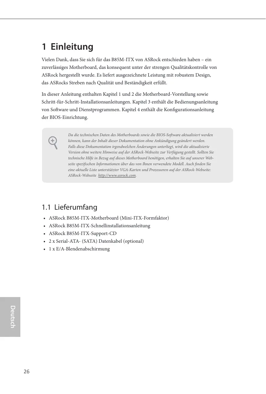 1 Einleitung Vielen Dank, dass Sie sich für das B85M-ITX von ASRock entschieden haben – ein zuverlässiges Motherboard, das konsequent unter der strengen Qualitätskontrolle von ASRock hergestellt wurde. Es liefert ausgezeichnete Leistung mit robustem Design, das ASRocks Streben nach Qualität und Beständigkeit erfüllt. In dieser Anleitung enthalten Kapitel 1 und 2 die Motherboard-Vorstellung sowie Schritt-für-Schritt-Installationsanleitungen. Kapitel 3 enthält die Bedienungsanleitung von Software und Dienstprogrammen. Kapitel 4 enthält die Konfigurationsanleitung der BIOS-Einrichtung. Da die technischen Daten des Motherboards sowie die BIOS-Software aktualisiert werden können, kann der Inhalt dieser Dokumentation ohne Ankündigung geändert werden. Falls diese Dokumentation irgendwelchen Änderungen unterliegt, wird die aktualisierte Version ohne weitere Hinweise auf der ASRock-Webseite zur Verfügung gestellt. Sollten Sie technische Hilfe in Bezug auf dieses Motherboard benötigen, erhalten Sie auf unserer Webseite spezifischen Informationen über das von Ihnen verwendete Modell. Auch finden Sie eine aktuelle Liste unterstützter VGA-Karten und Prozessoren auf der ASRock-Webseite: ASRock-Webseite http://www.asrock.com.