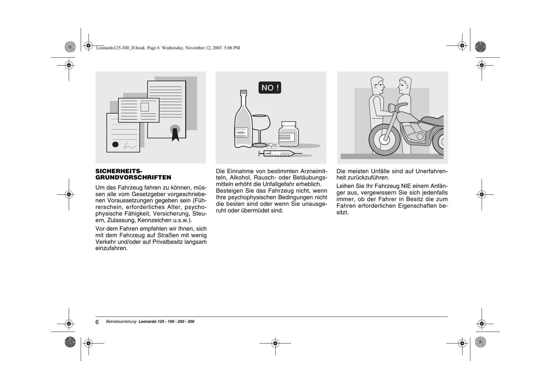 Leonardo125-300_D.book Page 6 Wednesday, November 12, 2003 5:06 PM SICHERHEITSGRUNDVORSCHRIFTEN Um das Fahrzeug fahren zu können, müssen alle vom Gesetzgeber vorgeschriebenen Voraussetzungen gegeben sein (Führerschein, erforderliches Alter, psychophysische Fähigkeit, Versicherung, Steuern, Zulassung, Kennzeichen u.s.w.). Vor dem Fahren empfehlen wir Ihnen, sich mit dem Fahrzeug auf Straßen mit wenig Verkehr und/oder auf Privatbesitz langsam einzufahren.