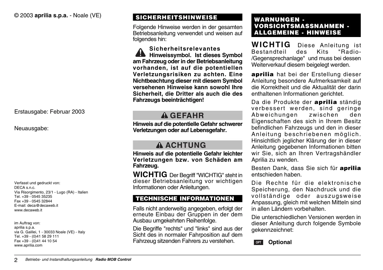 BEDIENUNGSANLEITUNG RADIO MOB CONTROL APRILIA
