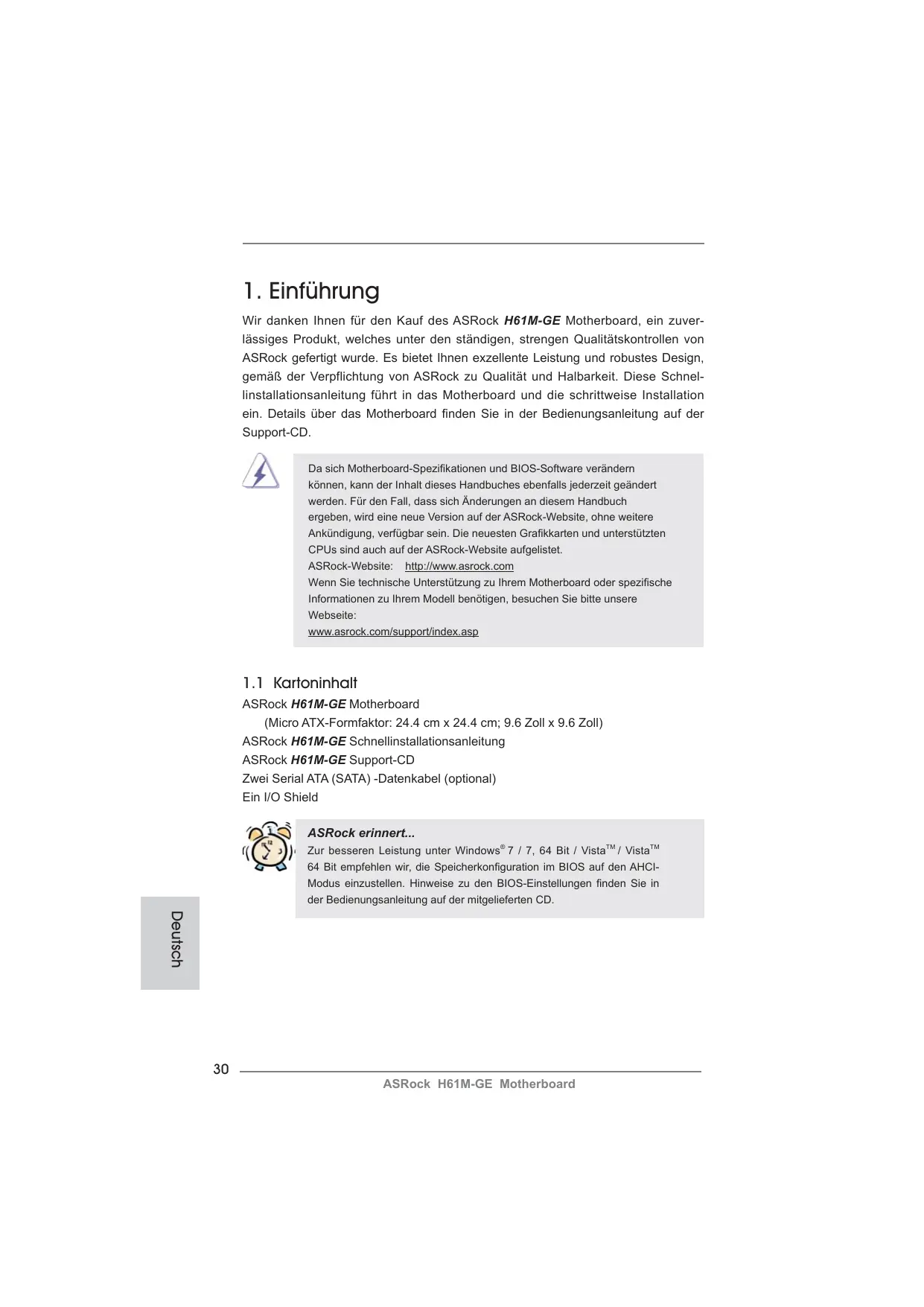 Wir danken Ihnen für den Kauf des ASRock H61M-GE Motherboard, ein zuverlässiges Produkt, welches unter den ständigen, strengen Qualitätskontrollen von ASRock gefertigt wurde. Es bietet Ihnen exzellente Leistung und robustes Design, gemäß der Verpflichtung von ASRock zu Qualität und Halbarkeit. Diese Schnellinstallationsanleitung führt in das Motherboard und die schrittweise Installation ein. Details über das Motherboard finden Sie in der Bedienungsanleitung auf der Support-CD. Da sich Motherboard-Spezifikationen und BIOS-Software verändern können, kann der Inhalt dieses Handbuches ebenfalls jederzeit geändert werden. Für den Fall, dass sich Änderungen an diesem Handbuch ergeben, wird eine neue Version auf der ASRock-Website, ohne weitere Ankündigung, verfügbar sein. Die neuesten Grafikkarten und unterstützten CPUs sind auch auf der ASRock-Website aufgelistet. ASRock-Website: http://www.asrock.com Wenn Sie technische Unterstützung zu Ihrem Motherboard oder spezifische Informationen zu Ihrem Modell benötigen, besuchen Sie bitte unsere Webseite: www.asrock.com/support/index.asp