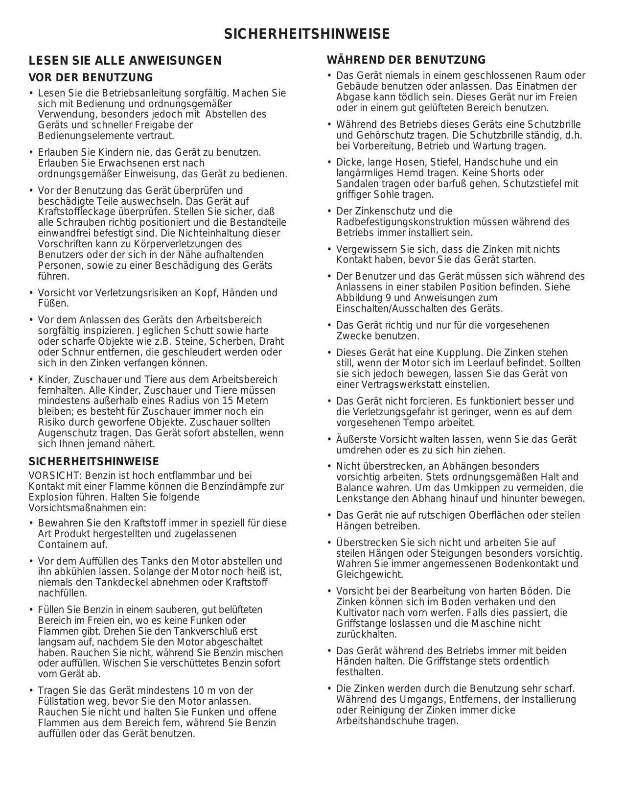 - Vor der Benutzung das Gerät überprüfen und beschädigte Teile auswechseln. Das Gerät auf Kraftstoffleckage überprüfen. Stellen Sie sicher, daß alle Schrauben richtig positioniert und die Bestandteile einwandfrei befestigt sind. Die Nichteinhaltung dieser Vorschriften kann zu Körperverletzungen des Benutzers oder der sich in der Nähe aufhaltenden Personen, sowie zu einer Beschädigung des Geräts führen.