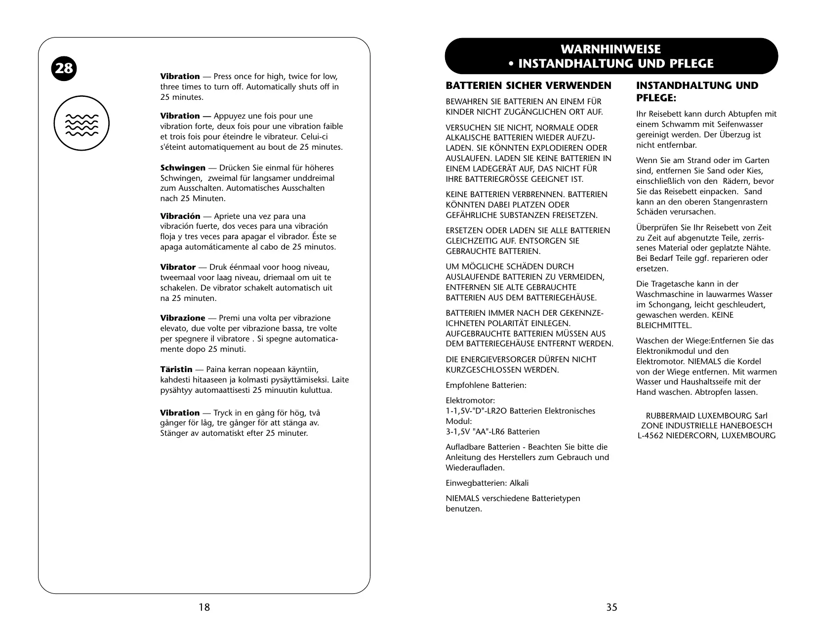 INSTANDHALTUNG UND PFLEGE: Ihr Reisebett kann durch Abtupfen mit einem Schwamm mit Seifenwasser gereinigt werden. Der Überzug ist nicht entfernbar. Wenn Sie am Strand oder im Garten sind, entfernen Sie Sand oder Kies, einschlieflich von den Rädern, bevor Sie das Reisebett einpacken. Sand kann an den oberen Stangenrastern Schäden verursachen. Überprüfen Sie Ihr Reisebett von Zeit zu Zeit auf abgenutzte Teile, zerris- senes Material oder geplatzte Nähte. Bei Bedarf Teile ggf. reparieren oder ersetzen. Die Tragetasche kann in der Waschmaschine in lauwarmes Wasser im Schongang, leicht geschleudert, gewaschen werden. KEINE BLEICHMITTEL. Waschen der Wiege:Entfernen Sie das Elektronikmodul und den Elektromotor. NIEMALS die Kordel von der Wiege entfernen. Mit warmen Wasser und Haushaltsseife mit der Hand waschen. Abtropfen lassen. RUBBERMAID LUXEMBOURG Sarl