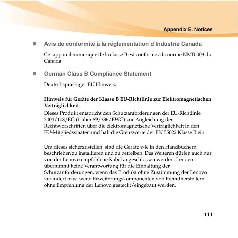 Un dieses sicherzustellen, sind die Geräte wie in den Handbüchern beschrieben zu installieren und zu betreiben. Des Weiteren dürfen auch nur von der Lenovo empfohlene Kabel angeschlossen werden. Lenovo übernimmt keine Verantwortung für die Einhaltung der Schutzanforderungen, wenn das Produkt ohne Zustimmung der Lenovo verändert bzw. wenn Erweiterungskomponenten von Fremdherstellern ohne Empfehlung der Lenovo gesteckt/eingebaut werden.
