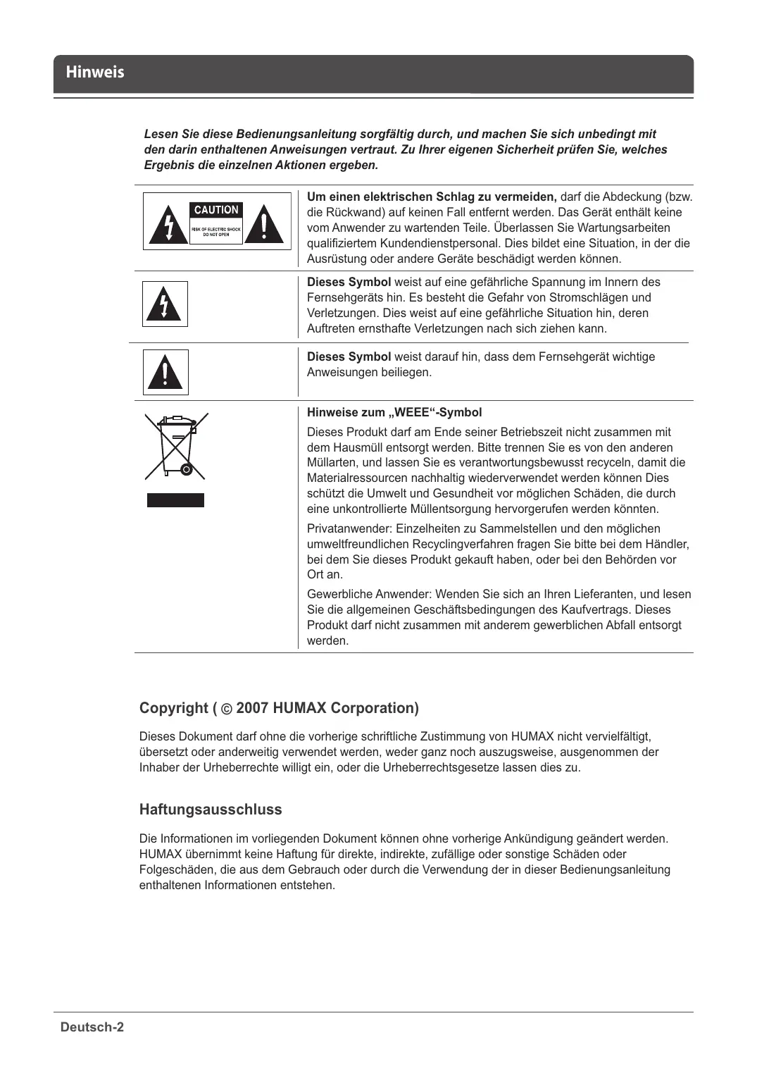 Die Informationen im vorliegenden Dokument konnen ohne vorherige Ankündigung geändert werden. HUMAX übernimmt keine Haftung für direkte, indirekte, zufällige oder sonstige Schäden oder Folgeschäden, die aus dem Gebrauch oder durch die Verwendung der in dieser Bedienungsanleitung enthaltenen Informationen entstehen.