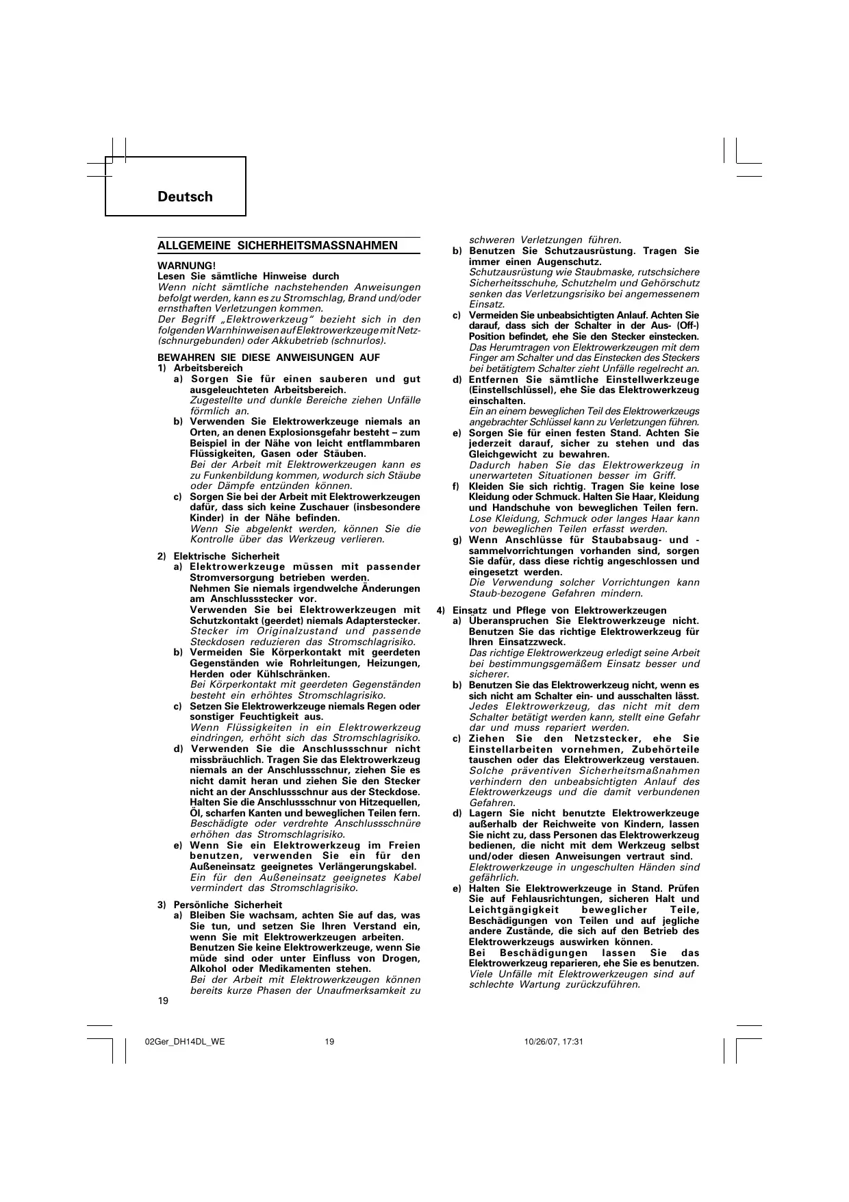 10/26/07, 17:31 Deutsch ALLGEMEINE SICHERHEITSMASSNAHMEN WARNUNG! Lesen Sie sämtliche Hinweise durch Wenn nicht sämtliche nachstehenden Anweisungen befolgt werden, kann es zu Stromschlag, Brand und/oder ernsthaften Verletzungen kommen. Der Begriff „Elektrowerkzeug“ bezieht sich in den folgenden Warnhinweisen auf Elektrowerkzeuge mit Netz(schnurgebunden) oder Akkubetrieb (schnurlos).