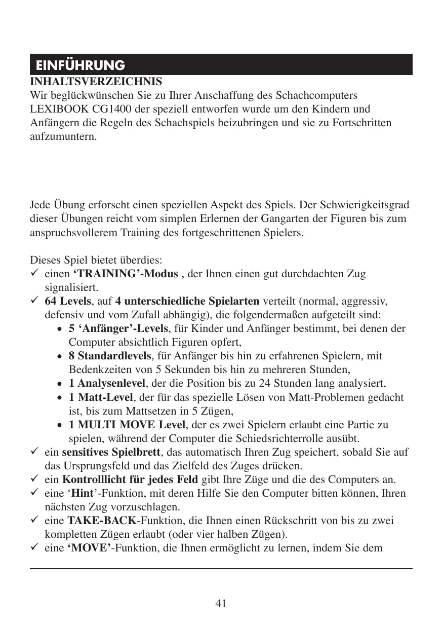 EINFÜHRUNG INHALTSVERZEICHNIS Wir beglückwünschen Sie zu Ihrer Anschaffung des Schachcomputers LEXIBOOK CG1400 der speziell entworfen wurde um den Kindern und Anfängern die Regeln des Schachspiels beizubringen und sie zu Fortschritten aufzumuntern.