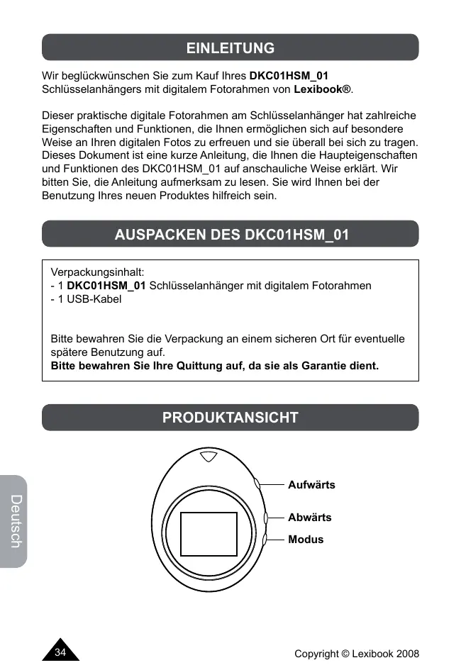 Dieser praktische digitale Fotorahmen am Schlüsselanhänger hat zahlreiche Eigenschaften und Funktionen, die Ihnen ermöglichs sich auf besondere Weise an ihren digitalen Fotos zu erfreu den und sie überall bei sich zu tragen. Dieses Dokument ist eine kurze Anleitung, die Ihnen die Haupteigenschaften und Funktionen des DKC01HSM_01 auf anschauliche Weise erklär. Wir bitten Sie, die Anleitung aufmerksam zu setzen. Sie wird Ihnen bei der Benutzung Ihres neuen Produktes hilfreich sein.