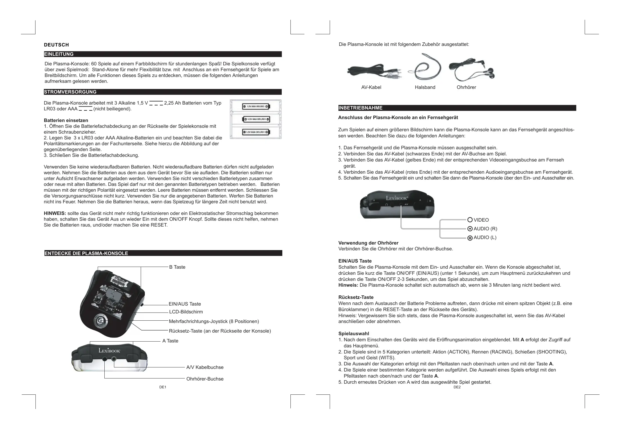 Die Plasma-Konsole: 60 Sipele auf einem Farbbildschirm für stundenlangen Spa! Die Spielkonsole verfügbar über zwei Spielmodi: Stand-Alone für mehr Flexibilität bzw. mit Anschluss an ein Fernsehgerät für Sipele am Breitbildschirm. Um alle Funktionen these Sipeis zu entdecken, müssen die folgenden Anleitungen aufmerksam gelesen werden.