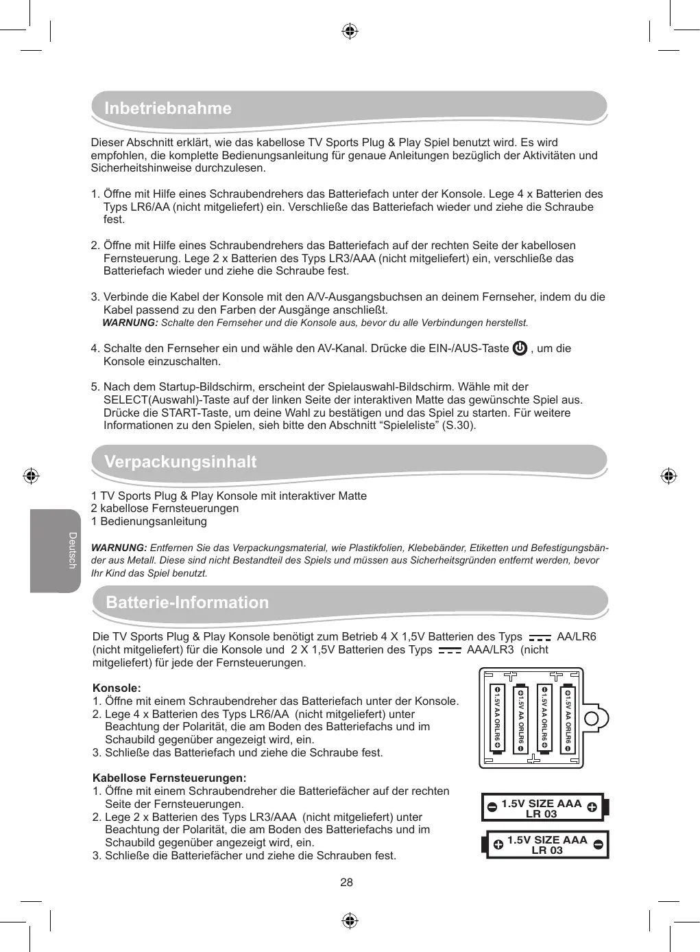 SELECT(Auswahl)-Taste auf der linken Seite der interaktiven Matte das gewünschte Spiel aus. Drücke die START-Taste, um deine Wahl zu bestätigen und das Spiel zu starten. Für weitere Informationen zu den Spielen, sieh bitte den Abschnitt “Spieleliste” (S.30). Verpackungsinhalt 1 TV Sports Plug & Play Konsole mit interaktiver Matte 2 kabellose Fernsteuerungen 1 Bedienungsanleitung Deutsch WARNUNG: Entfernen Sie das Verpackungsmaterial, wie Plastikfolien, Klebebänder, Etiketten und Befestigungsbänder aus Metall. Diese sind nicht Bestandteil des Spiels und müssen aus Sicherheitsgründen entfernt werden, bevor Ihr Kind das Spiel benutzt. Batterie-Information Die TV Sports Plug & Play Konsole benötigt zum Betrieb 4 X 1,5V Batterien des Typs AA/LR6 (nicht mitgeliefert) für die Konsole und 2 X 1,5V Batterien des Typs AAA/LR3 (nicht mitgeliefert) für jede der Fernsteuerungen.