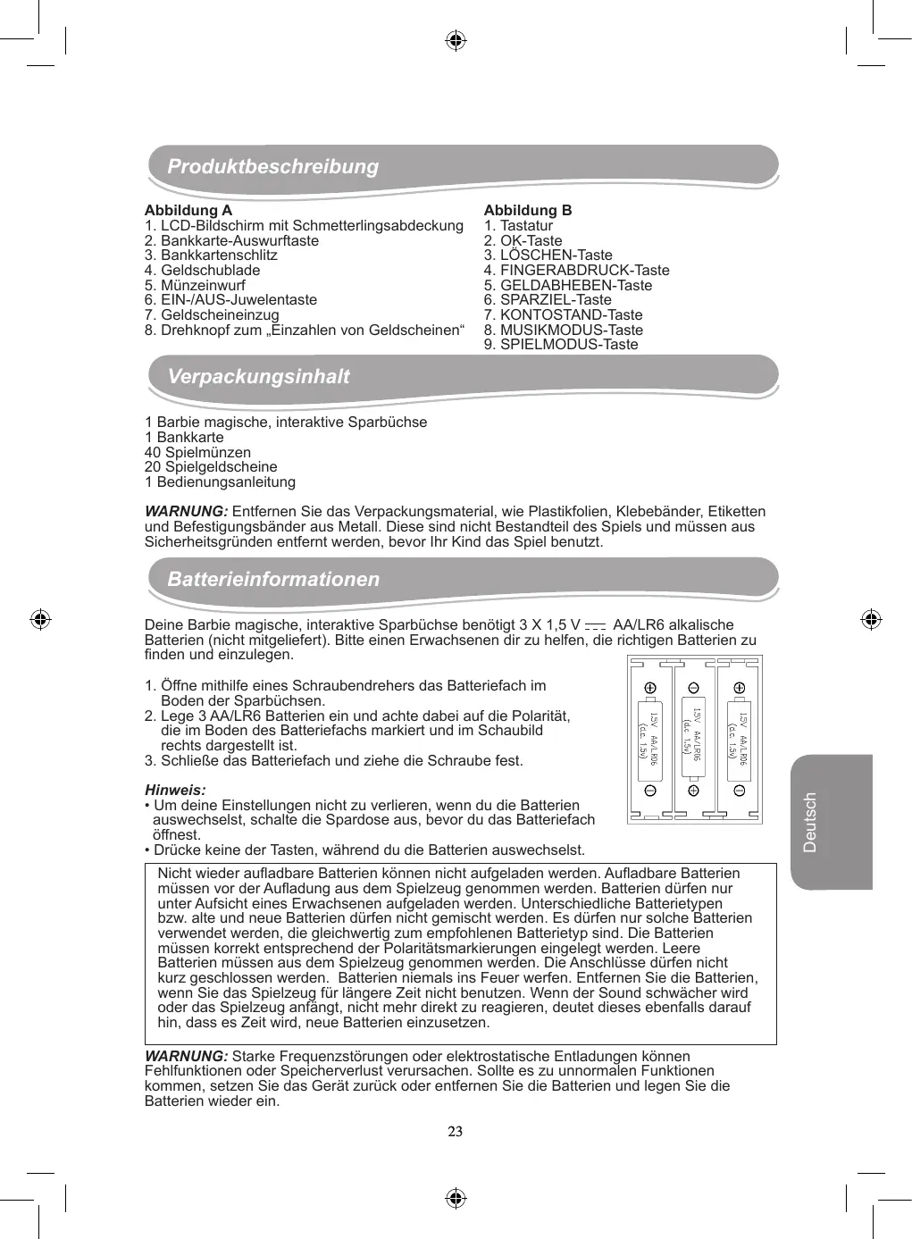 Verpackungsinhalt 1 Barbie magische, interaktive Sparbüchse 1 Bankkarte 40 Spielmünzen 20 Spielgeldscheine 1 Bedienungsanleitung WARNUNG: Entfernen Sie das Verpackungsmaterial, wie Plastikfolien, Klebebänder, Etiketten und Befestigungsbänder aus Metall. Diese sind nicht Bestandteil des Spiels und müssen aus Sicherheitsgründen entfernt werden, bevor Ihr Kind das Spiel benutzt. Batterieinformationen Deine Barbie magische, interaktive Sparbüchse benötigt 3 X 1,5 V AA/LR6 alkalische Batterien (nicht mitgeliefert). Bitte einen Erwachsenen dir zu helfen, die richtigen Batterien zu finden und einzulegen. Hinweis: