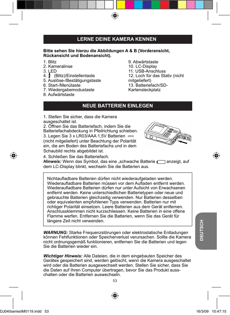 1. Assurez-vous que l’appareil photo soit éteint. 2. Ouvrez le compartiment des piles en faisant glisser le couvercle dans le sens de la flèche. 3. Insérez 3 piles de type LR03/AAA de 1.5V (non fournies) en prenant soin de respecter les polarités indiquées au fond du compartiment des piles et selon le schéma ci-contre. 4. Refermez le couvercle. Note : Si le symbole de faible charge clignote, il est nécessaire de remplacer les piles au plus vite. Ne pas recharger les piles non rechargeables. Retirer les accumulateurs du produit avant de les recharger. Ne charger les accumulateurs que sous la surveillance d’un adulte. Ne pas mélanger différents types de piles ou accumulateurs, ou des piles et accumulateurs neufs et usagés. Les piles et accumulateurs doivent être mis en place en respectant la polarité. Les piles et accumulateurs usagés doivent être enlevés du produit. Les bornes d’une pile ou d’un accumulateur ne doivent pas être mises en court-circuit. Ne pas jeter les piles au feu. Retirer les piles en cas de non utilisation prolongée. ATTENTION : D’importantes interférences électromagnétiques ou des décharges électrostatiques peuvent provoquer un dysfonctionnement ou une perte de données. Si l’appareil ne fonctionne pas correctement, enlevez puis remettez les piles. Remarque importante : Tous les fichiers enregistrés dans la mémoire interne de l’appareil s’effacent lorsque les piles sont remplacées ou quand vous éteignez l’unité. Assurez-vous de transférer les fichiers sur votre ordinateur avant cette manipulation.