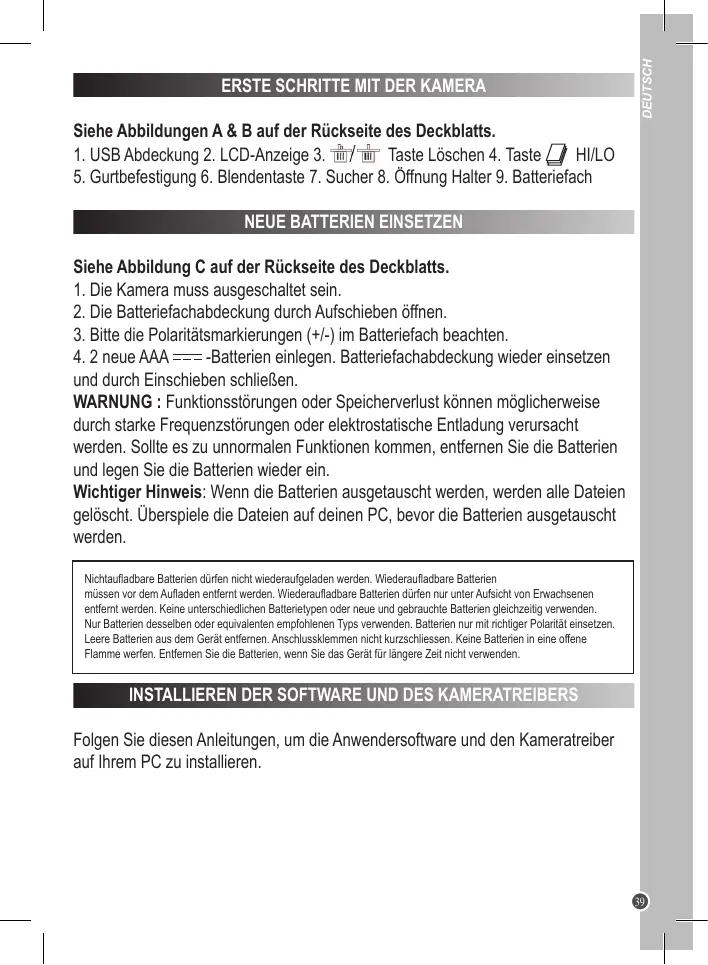 -Batterien einlegen. Batteriefachabdeckung wieder einsetzen und durch Einschieben schließen. WARNUNG : Funktionsstörungen oder Speicherverlust können möglicherweise durch starke Frequenzstörungen oder elektrostatische Entladung verursacht werden. Sollte es zu unnormalen Funktionen kommen, entfernen Sie die Batterien und legen Sie die Batterien wieder ein. Wichtiger Hinweis: Wenn die Batterien ausgetauscht werden, werden alle Dateien gelöscht. Überspiele die Dateien auf deinen PC, bevor die Batterien ausgetauscht werden. Nichtaufladbare Batterien dürfen nicht wiederaufgeladen werden. Wiederaufladbare Batterien müssen vor dem Aufladen entfernt werden. Wiederaufladbare Batterien dürfen nur unter Aufsicht von Erwachsenen entfernt werden. Keine unterschiedlichen Batterietypen oder neue und gebrauchte Batterien gleichzeitig verwenden. Nur Batterien desselben oder equivalenten empfohlenen Typs verwenden. Batterien nur mit richtiger Polarität einsetzen. Leere Batterien aus dem Gerät entfernen. Anschlussklemmen nicht kurzschliessen. Keine Batterien in eine offene Flamme werfen. Entfernen Sie die Batterien, wenn Sie das Gerät für längere Zeit nicht verwenden.