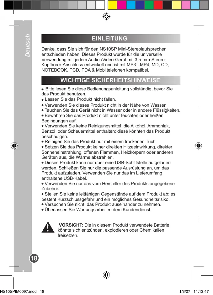1/3/07 11:13:47 Deutsch EINLEITUNG Danke, dass Sie sich für den NS10SP Mini-Stereolautsprecher entschieden haben. Dieses Produkt wurde für die universelle Verwendung mit jedem Audio-/Video-Gerät mit 3,5-mm-StereoKopfhörer-Anschluss entwickelt und ist mit MP3-, MP4, MD, CD, NOTEBOOK, PCD, PDA & Mobiltelefonen kompatibel. WICHTIGE SICHERHEITSHINWEISE Bitte lesen Sie diese Bedienungsanleitung vollständig, bevor Sie das Produkt benutzen. l Lassen Sie das Produkt nicht fallen. l Verwenden Sie dieses Produkt nicht in der Nähe von Wasser. l Tauchen Sie das Gerät nicht in Wasser oder in andere Flüssigkeiten. l Bewahren Sie das Produkt nicht unter feuchten oder heißen Bedingungen auf. l Verwenden Sie keine Reinigungsmittel, die Alkohol, Ammoniak, Benzol oder Scheuermittel enthalten; diese könnten das Produkt beschädigen. l Reinigen Sie das Produkt nur mit einem trockenen Tuch. l Setzen Sie das Produkt keiner direkten Hitzeeinwirkung, direkter Sonneneinstrahlung, offenen Flammen, Heizkörpern oder anderen Geräten aus, die Wärme abstrahlen. l Dieses Produkt kann nur über eine USB-Schittstelle aufgeladen werden. Schließen Sie nur die passende Ausrüstung an, um das Produkt aufzuladen. Verwenden Sie nur das im Lieferumfang enthaltene USB-Kabel. l Verwenden Sie nur das vom Hersteller des Produkts angegebene Zubehör. l Stellen Sie keine leitfähigen Gegenstände auf dem Produkt ab; es besteht Kurzschlussgefahr und ein mögliches Gesundheitsrisiko. l Versuchen Sie nicht, das Produkt auseinander zu nehmen. l Überlassen Sie Wartungsarbeiten dem Kundendienst.