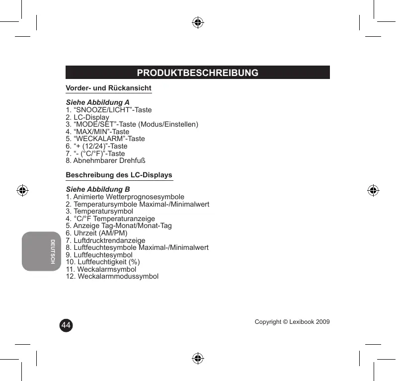 - Falls zwischen der Wettervorhersage Ihrer örtlichen Wetterstation und des Gerätes Widersprüchlichkeiten bestehen, sollte die Vorhersage der örtlichen Wetterstation Vorrang haben. DEUTSCH Luftdrucktrend Die Trendanzeige stellt den neuesten Trend des Luftdrucks dar. Im Allgemeinen hängt schlechtes Wetter mit tiefem Luftdruck zusammen und gutes Wetter mit einem hohen Luftdruck. Der Luftdrucktrend ist steigend. Der Luftdrucktrend ist konstant. Der Luftdrucktrend ist fallend. Copyright © Lexibook 2009