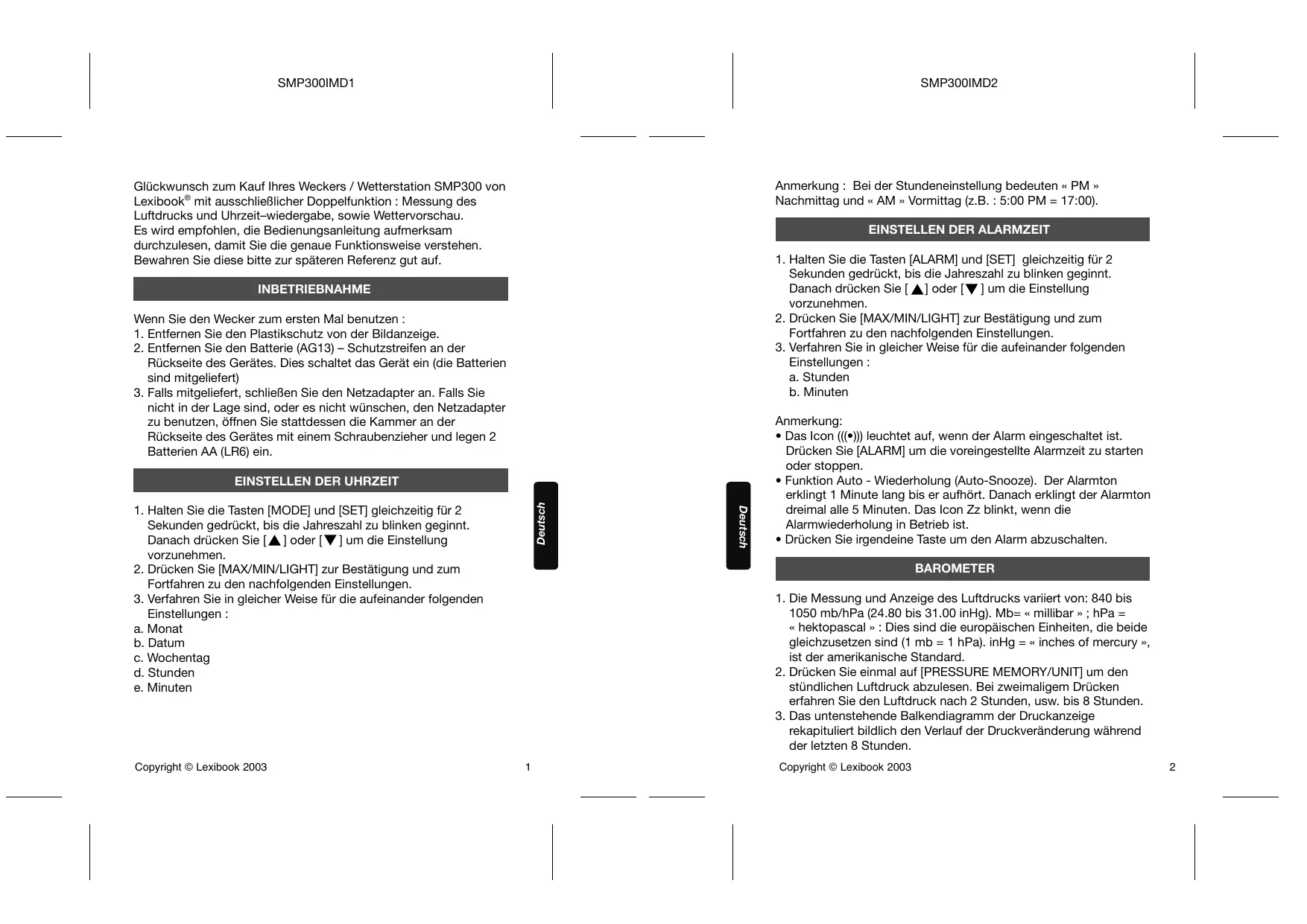 Glickwunsch zum Kauf Ihres Weckers / Wetterstation SMP300 von Lexibook mit ausschließlich Doppelfungtion : Messung des Luft/drucks und Uhrzeit-wiedergabe, sowie Wettervorschau. Es wird empfohlen, die Bedienungsanleitung aufmerksam durchzulesen, damit Sie dieGPCa Funktionseweise verstehen. Bewahren Sie dieseitte zur spateren Referenz gut auf.