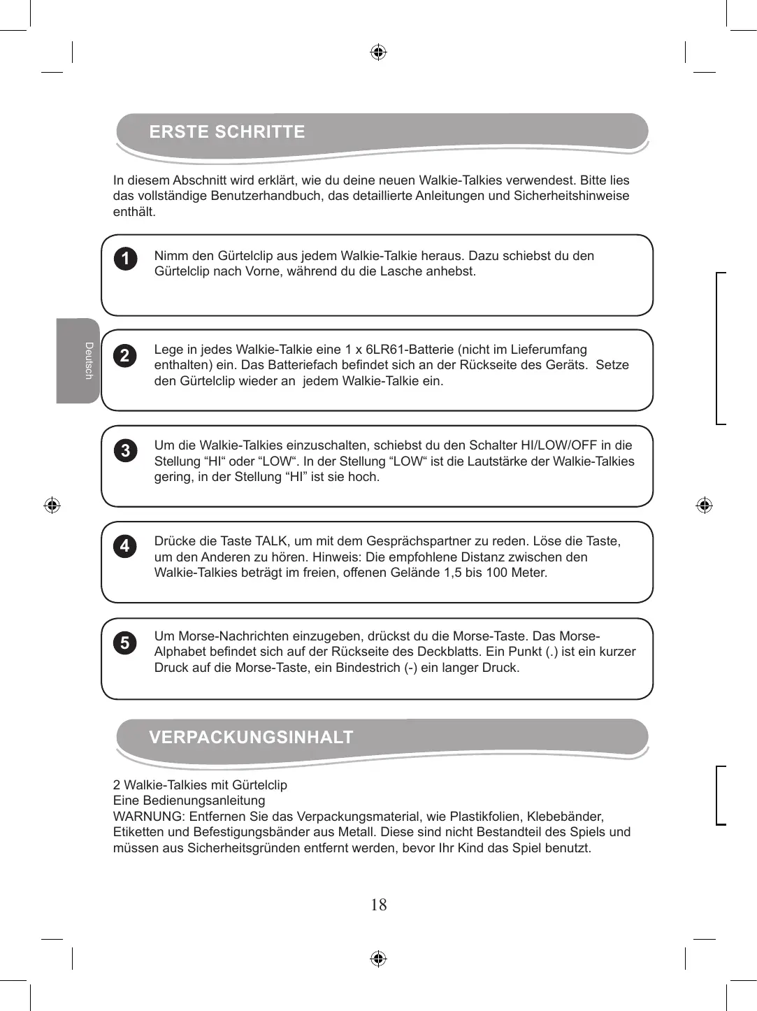 Um Morse-Nachrichten einzugeben, drückst du die Morse-Taste. Das MorseAlphabet befindet sich auf der Rückseite des Deckblatts. Ein Punkt (.) ist ein kurzer Druck auf die Morse-Taste, ein Bindestrich (-) ein langer Druck. VERPACKUNGSINHALT 2 Walkie-Talkies mit Gürtelclip Eine Bedienungsanleitung WARNUNG: Entfernen Sie das Verpackungsmaterial, wie Plastikfolien, Klebebänder, Etiketten und Befestigungsbänder aus Metall. Diese sind nicht Bestandteil des Spiels und müssen aus Sicherheitsgründen entfernt werden, bevor Ihr Kind das Spiel benutzt.