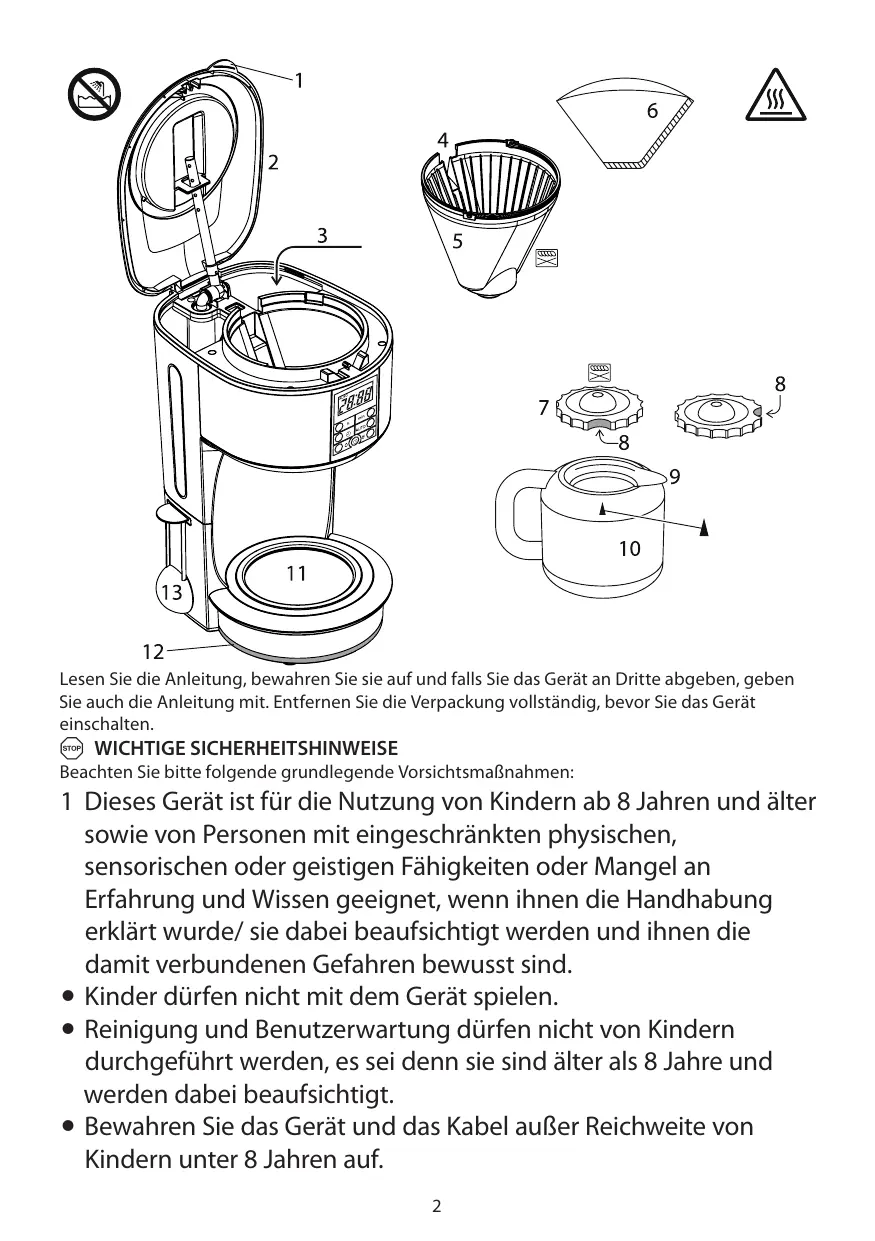 1 Dieses Gerät ist für die Nutzung von Kindern ab 8 Jahren und älter sowie von Personen mit eingeschränkten physischen, sensorischen oder geistigen Fähigkeiten oder Mangel an Erfahrung und Wissen geeignet, wenn ihnen die Handhabung erklärt wurde/ sie dabei beaufsichtigt werden und ihnen die damit verbundenen Gefahren bewusst sind. • Kinder dürfen nicht mit dem Gerät spielen. • Reinigung und Benutzerwartung dürfen nicht von Kindern durchgeführt werden, es sei denn sie sind älter als 8 Jahre und werden dabei beaufsichtigt. • Bewahren Sie das Gerät und das Kabel außer Reichweite von Kindern unter 8 Jahren auf. 2